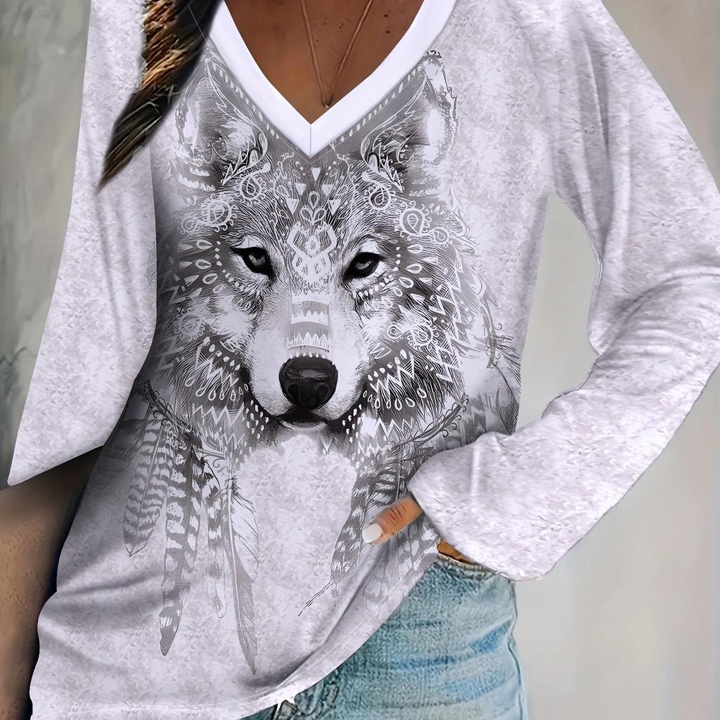 Vibrant Wolf Head Print V-Neck T-Shirt Soft Micro Elasticity Semi-Sheer Printing Casual Long Sleeve Top for Spring Fall Womens Polyester Clothing — buy online with free worldwide shipping!