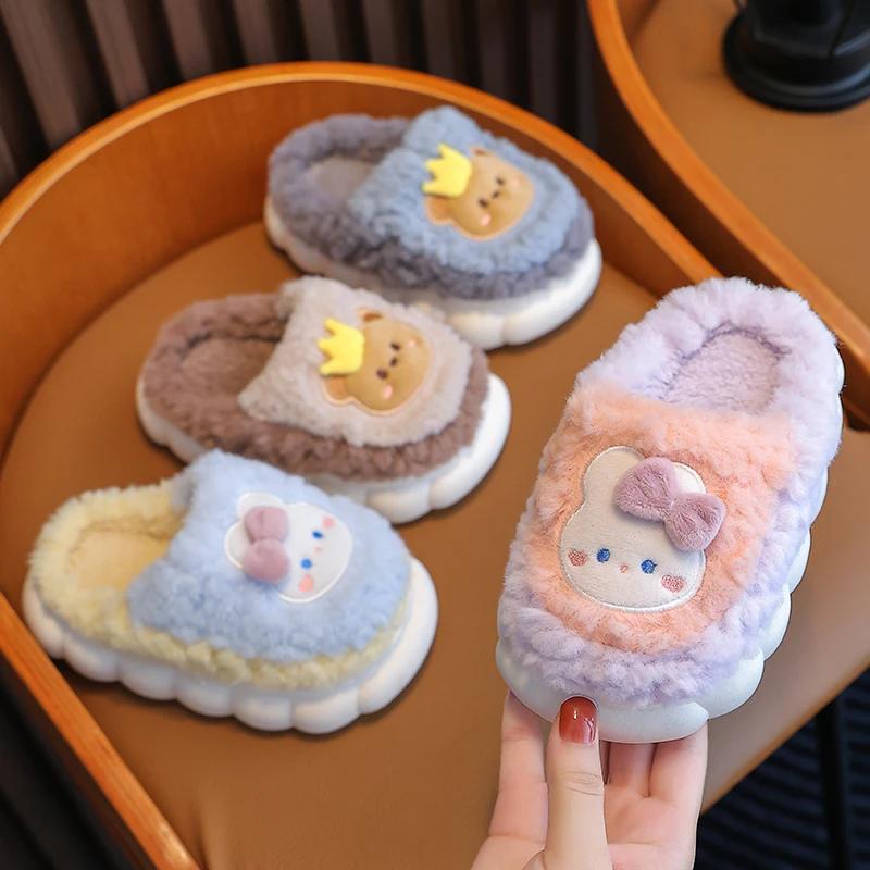 New Winter Cute Rabbit Bear Cotton Flip Flops Children's Plush Slippers For Girls Boys Home Indoor Fluffy Mule Kids Shoes