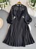 Pink Crochet Lace Hollow Out Embroidery Patchwork Pleated Dress New Summer Women O Neck Lantern Sleeve Slim Holiday Party Dress