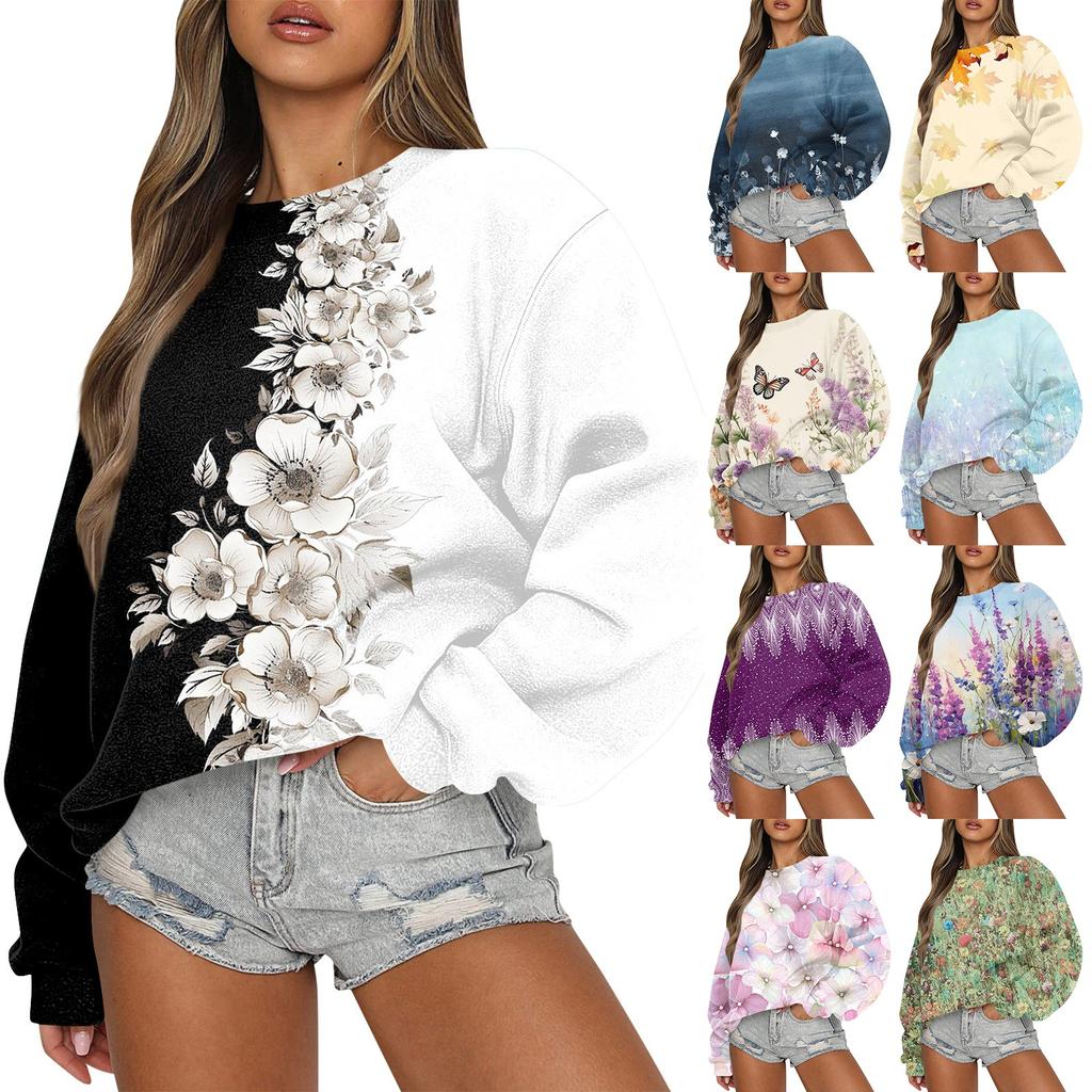 Women's Casual Fashion Retro Floral Print Long Sleeved Knitted Sportswear Top Loose Fit