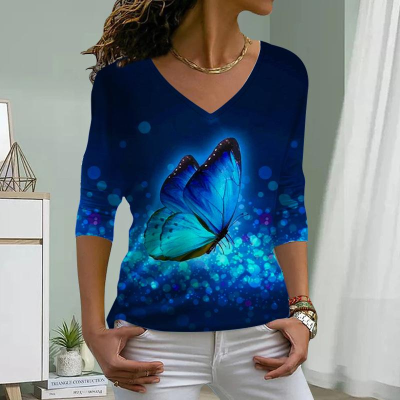 Fluorescent Butterfly Print Women Tshirts Ladies Tops Long Sleeve V-neck Pullover Femme T-shirts T Shirt For Women