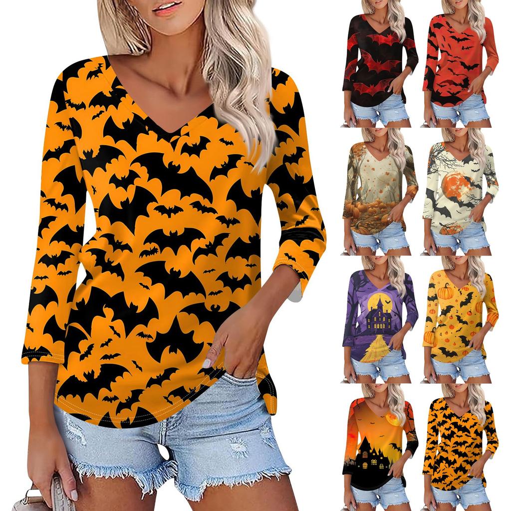 Shirt For Women's Fashion Casual V Neck 3/4 Sleeve Loose Halloween Printed T-Shirt Ladies Top — buy online with free worldwide shipping!