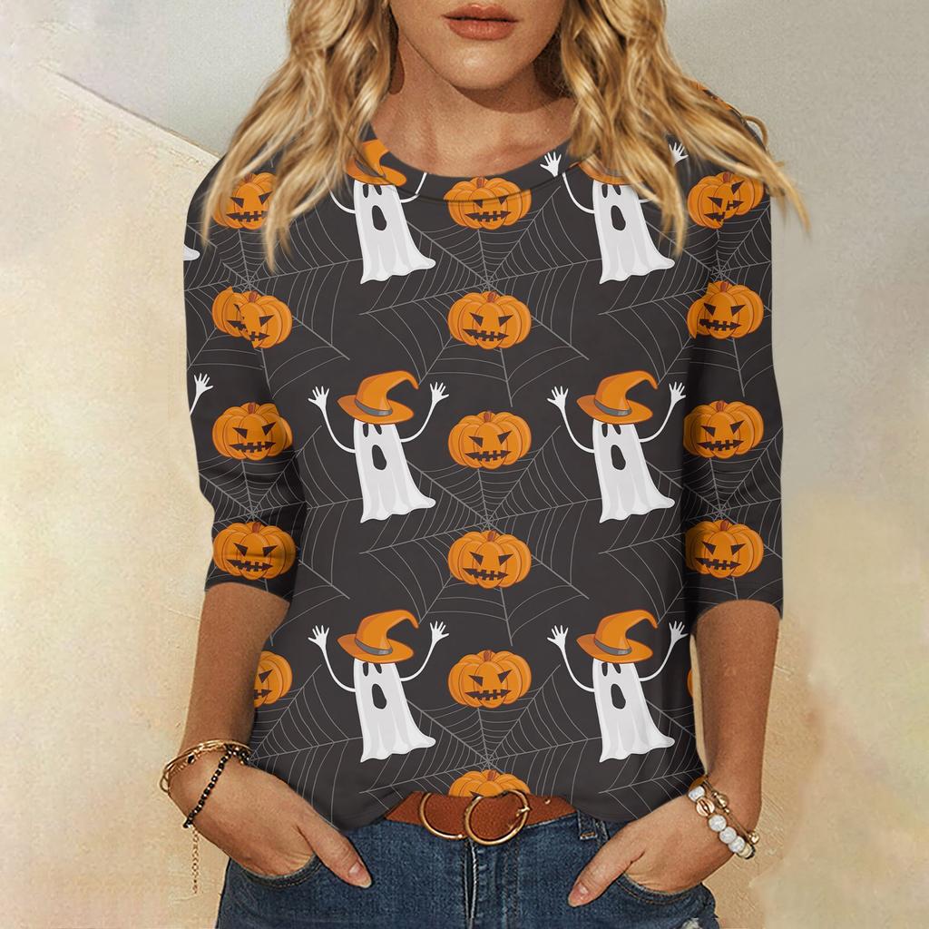Women's Fashion Casual Round Neck 3/4 Sleeve Loose Halloween Printed T-Shirt Ladies Top