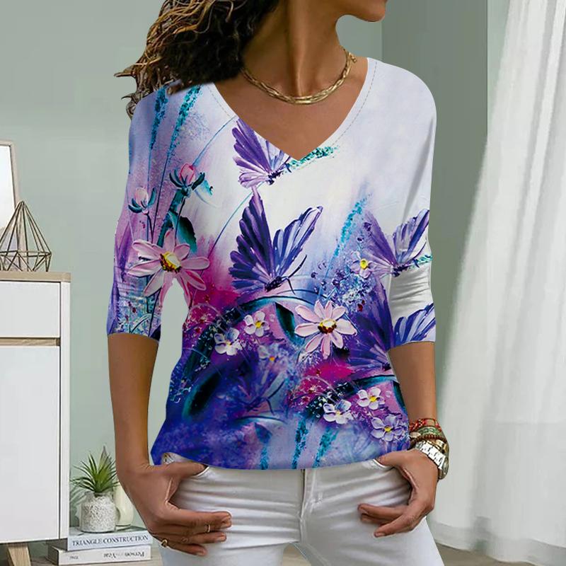 Higanbana Print Women Tshirts Ladies Tops Long Sleeve V-neck Pullover Femme T-shirts T Shirt For Women — buy online with free worldwide shipping!