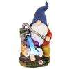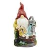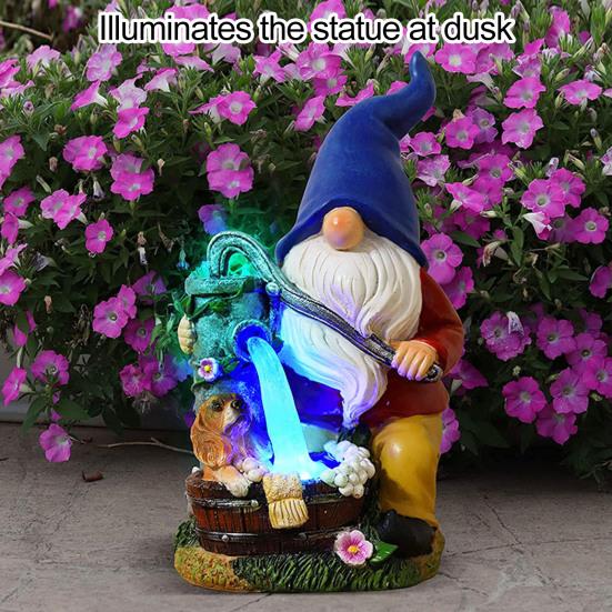 Enhance your garden with this charming gnome figurine Solar Garden Decoration. Powered by solar panels, this gnome charges during the day and lights up at dusk for 8-10 hours. Perfect for gardens, courtyards, patios, and more. The adorable Gnome Figurine features a gnome giving his dog a bath with intricate details and a blue light effect at dusk.