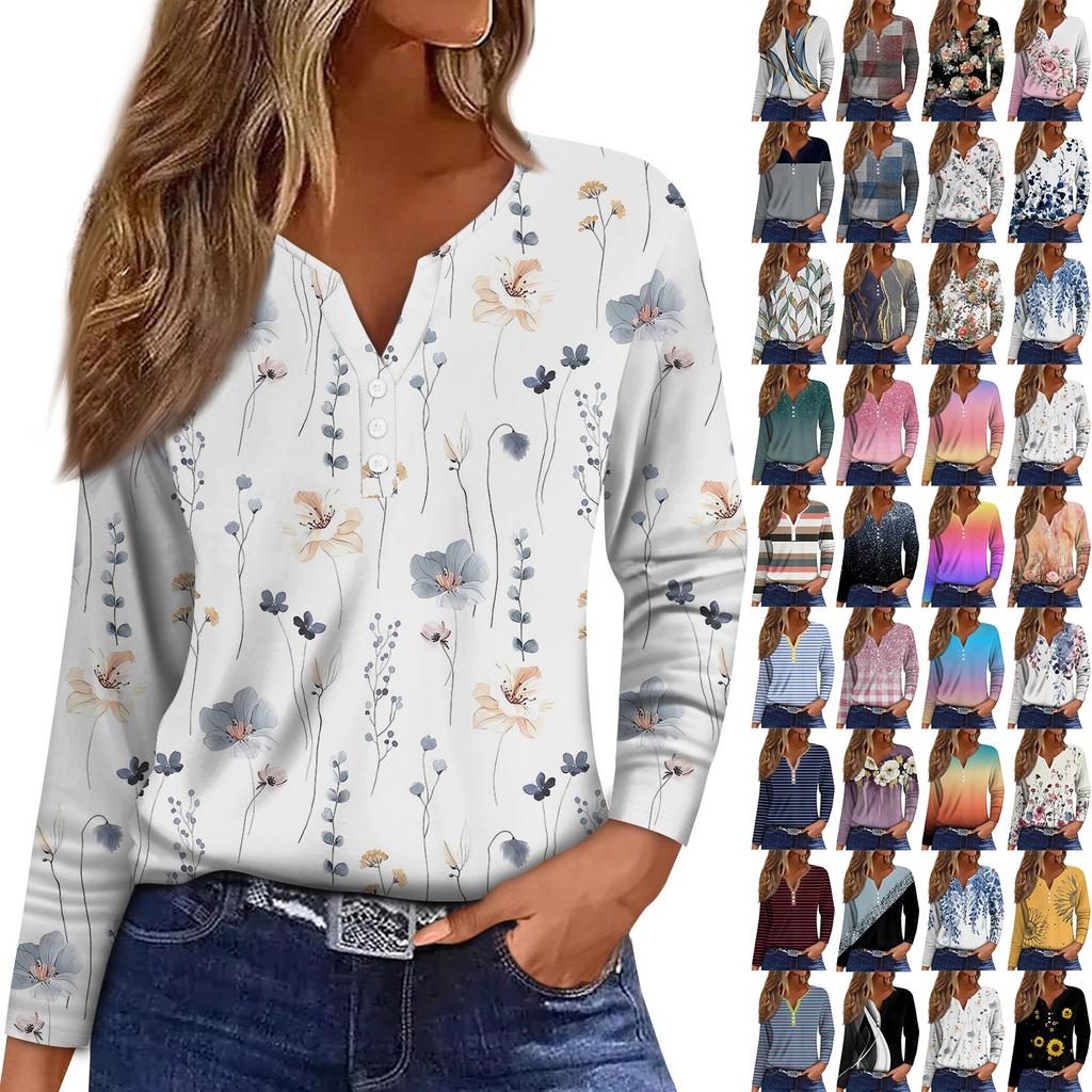 Women's T Shirt Tee Button Floral Print Long Sleeve Daily Weekend Fashion Basic V-Neck Regular Top — buy online with free worldwide shipping!