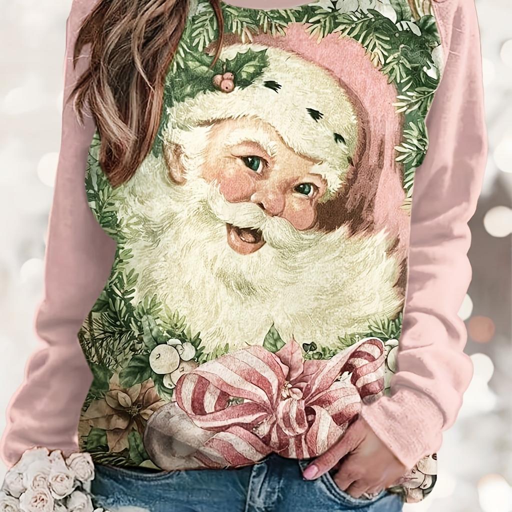 Plus Size Christmas Casual Tops, Women's Plus Size Santa Print Long Sleeve Crew Neck Tops — buy online with free worldwide shipping!