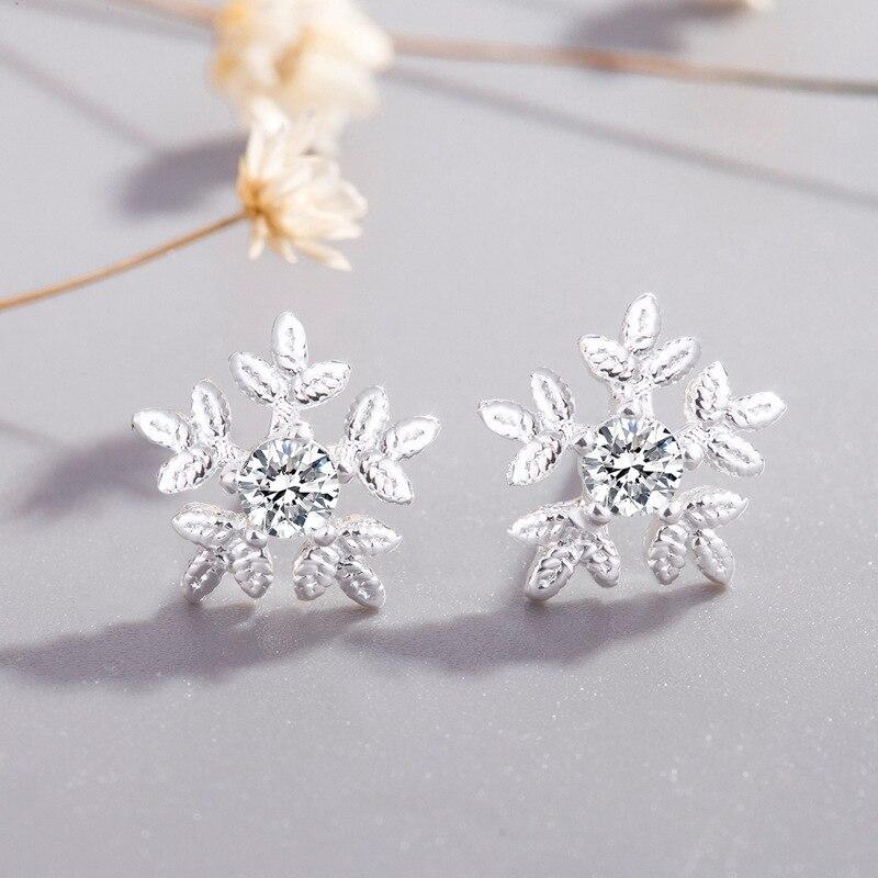 Simple 925 Sterling Silver Crystal Snowfake Stud Earrings for Women Prevent Allergy Brincos Pendientes A141