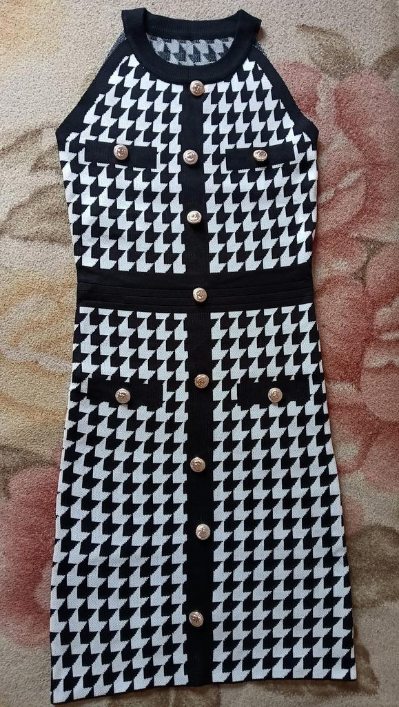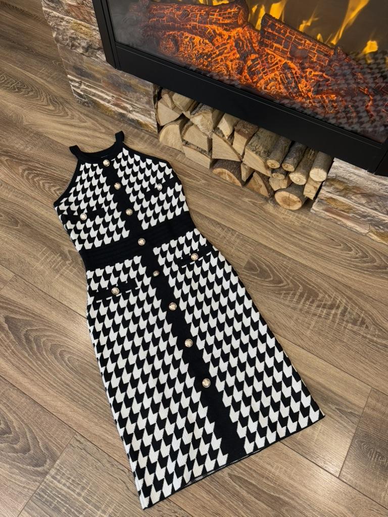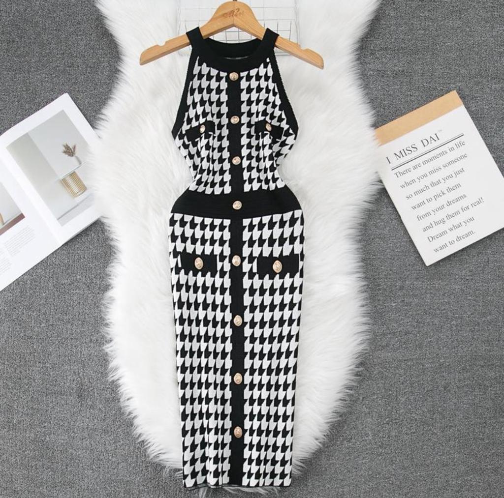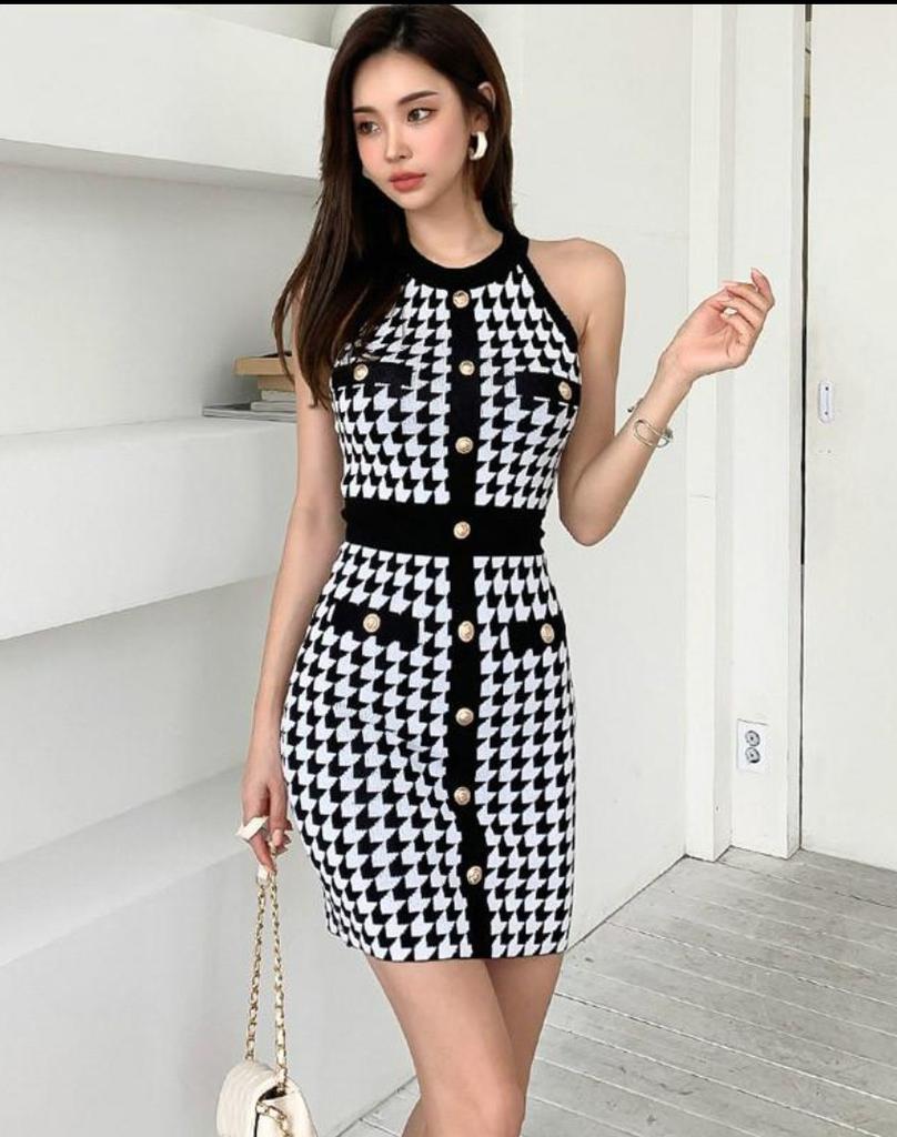 Summer Women Elegant Houndstooth Sleeveless Knitted Sweater Mini Short Slim Bodycon Pullover Dresses