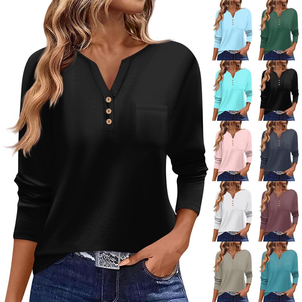 Women's T Shirt Tee Button Long Sleeve Daily Weekend Fashion Basic V- Neck Regular Top With Pocket