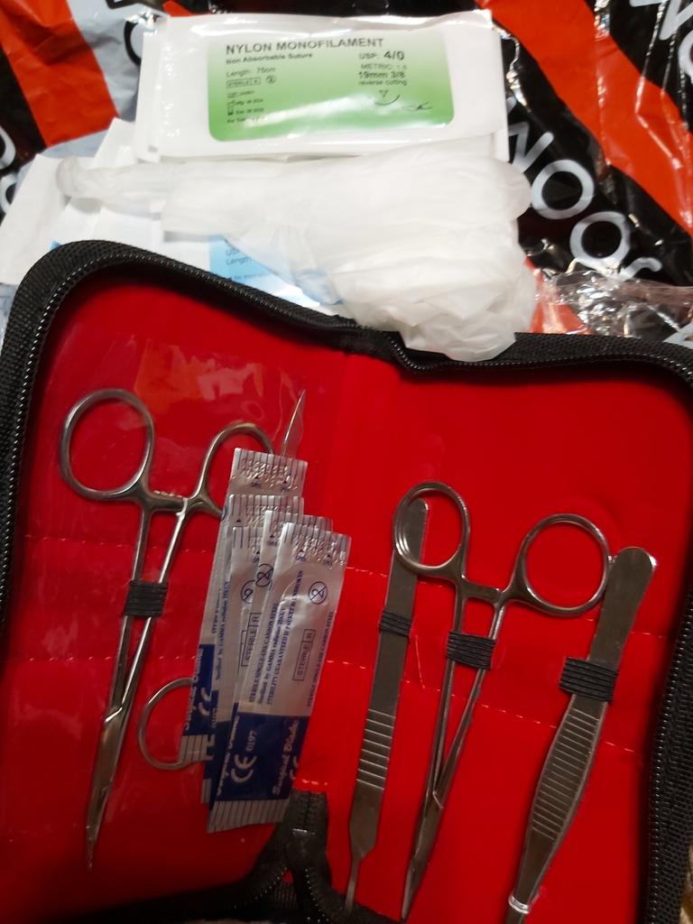 Package Included: 1Pcs needle holding forceps (12.5cm),1Pcs hemostatic 1Pcs forceps (12.5cm),1Pcs scissors,1Pcs tissue forceps,1Pcs handle (3 #),1Pcs silicone suture pad (17 * 12cm),6Pcs nylon needle suture thread,6Pcs silk needle suture thread,1Pcs tool kit,1Pair gloves