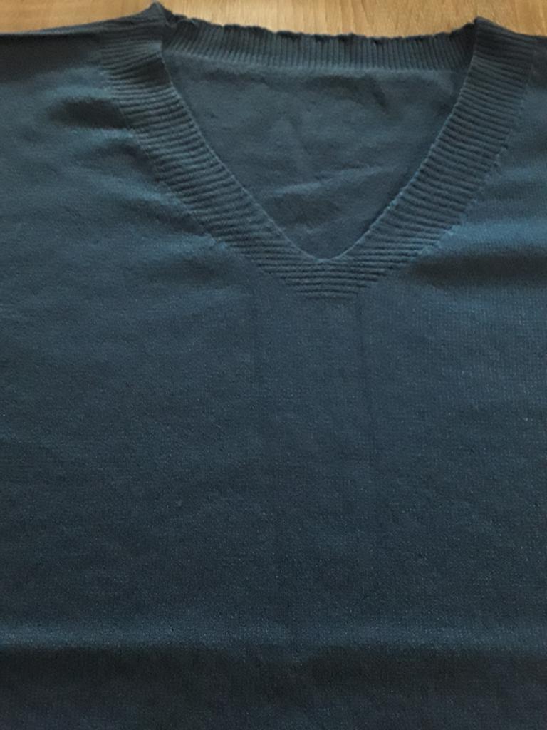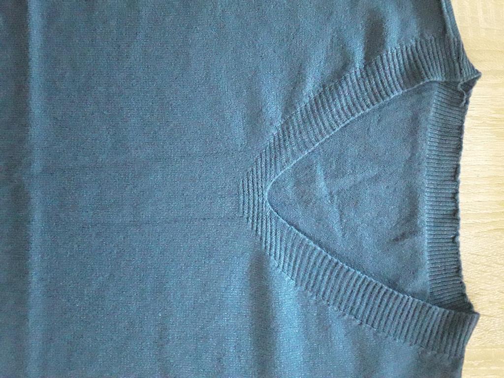 Under the V-neck, material defect. At the collar back defect- fringes.