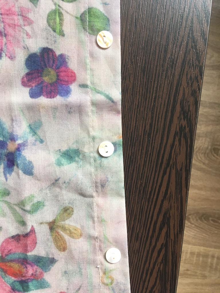 Cotton. The shirt is just right. I would like it to be bigger, but they don't make other sizes. I thought the buttons were different, but they were just sewn on the wrong side. This can be fixed. Thank you.