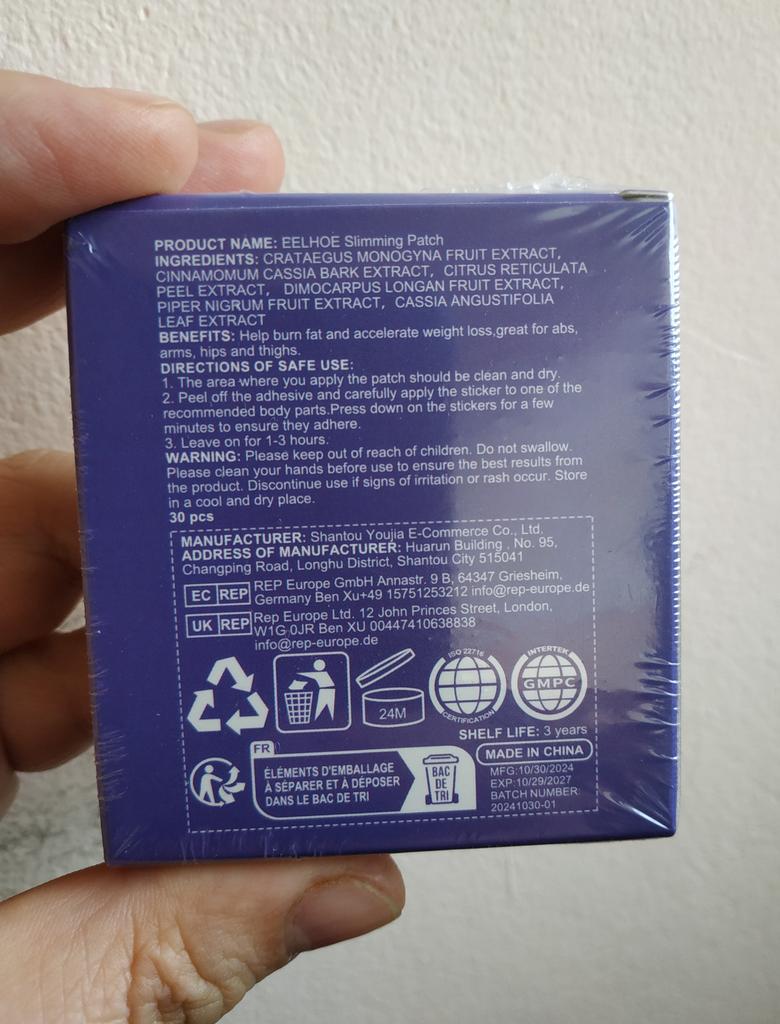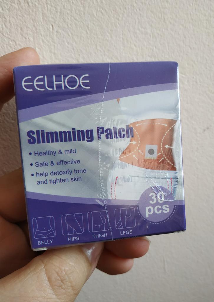 Slimming patches, 30 pcs.. One package contains 30 patches, which are approximately 5*5 cm in size.. The patches are squares with an adhesive layer on parchment paper. In the middle of each patch is a circle with a protective layer of paper, which must also be removed before attaching the patch to the skin.. The date of manufacture and expiration date are not indicated anywhere, only the expiration date after opening the package is indicated - 24 months.