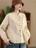 Johnature Woman Autumn Chinese Style Vintage Splicing Turn Down Collar Shirt Long Sleeves Solid Color Corduroy Shirt