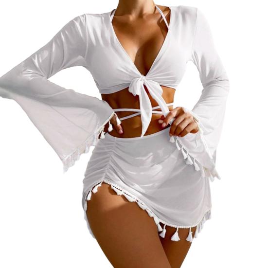 Introducing our four-piece swimsuit set, perfect for any occasion. This set includes a sexy deep V-neck bikini swimsuit, trunks, a short blouse, and a mesh skirt.