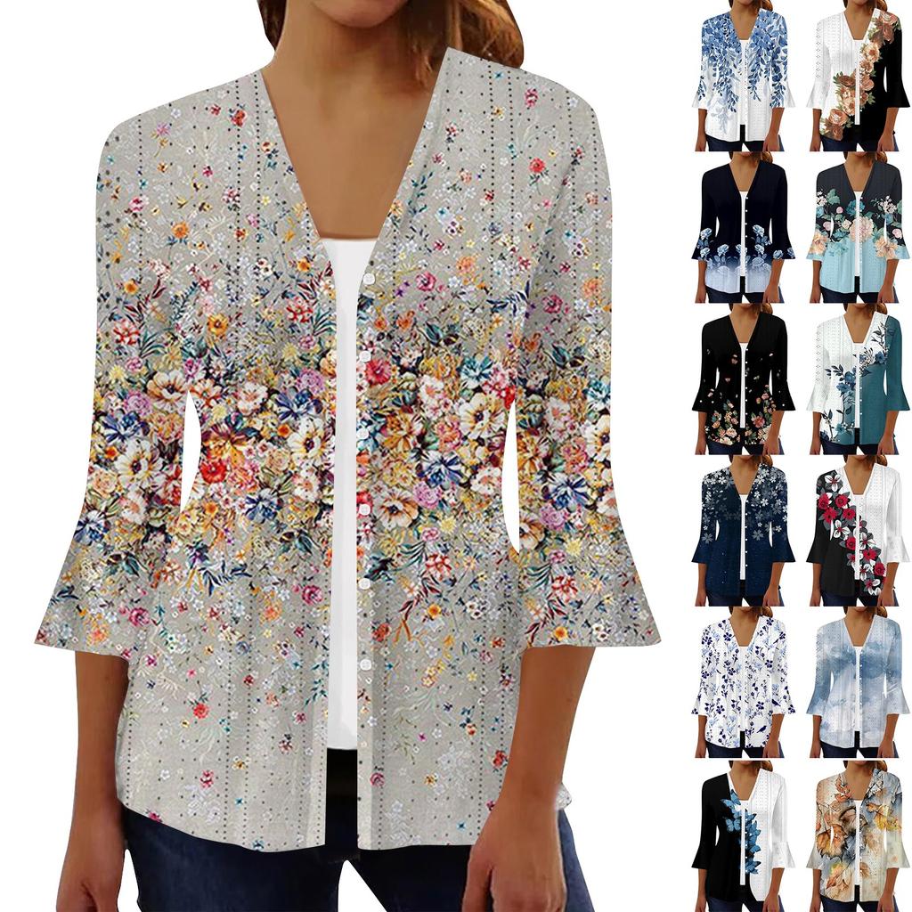 Women's Fashion Loose Casual Printed Three-quarter Sleeve Button Shirt Cardigan Top — buy online with free worldwide shipping!