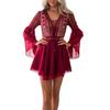 Women Mini Dress V Neck Long Flared Sleeve Crochet Hollow Out Chiffon Bandage Party Dress
