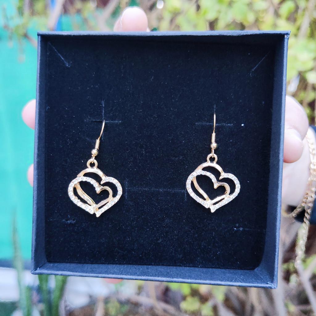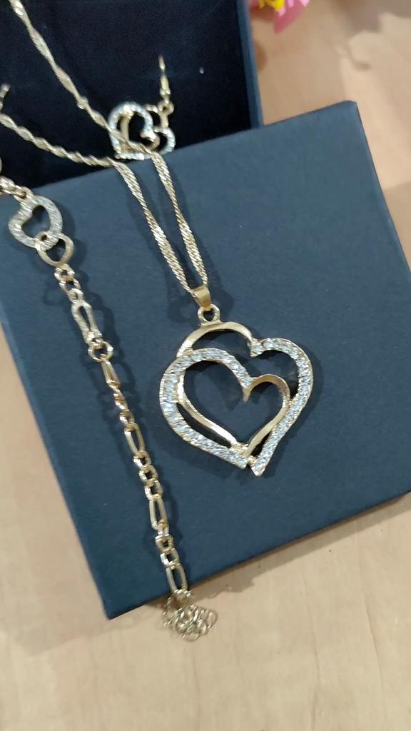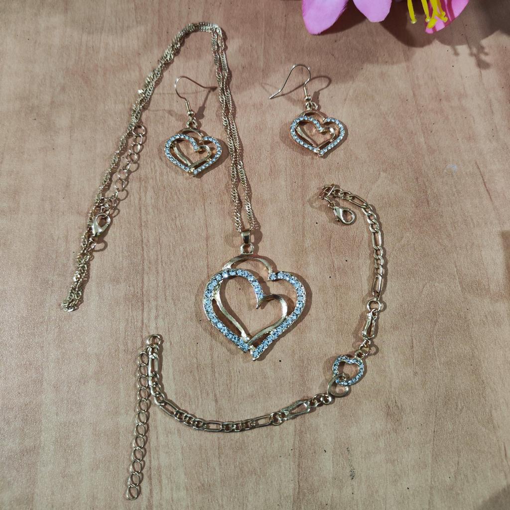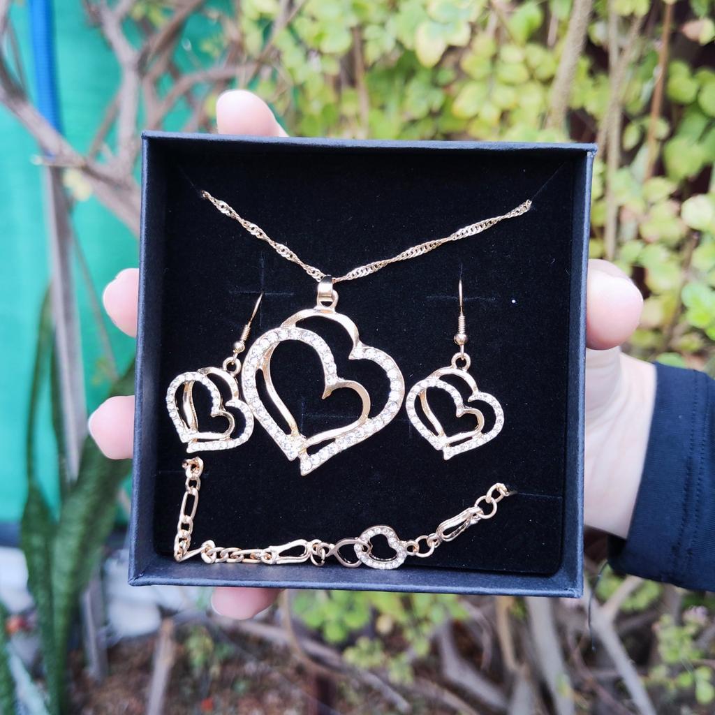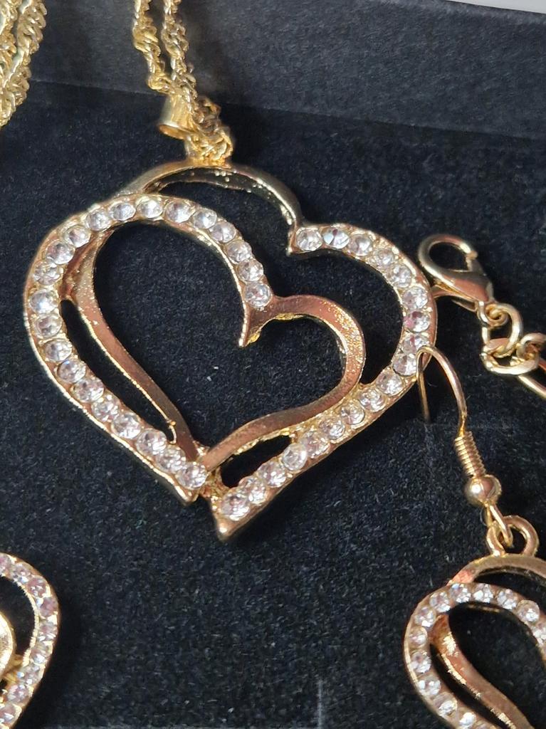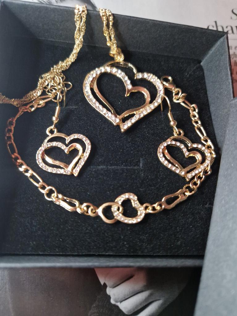 Very beautiful set with hearts in gold finish and clear rhinestones.The set consists of necklace,bracelet and earrings Perfect as a gift as came in lovely presentation box.Delivery took around 4 weeks.Happy Shopping!