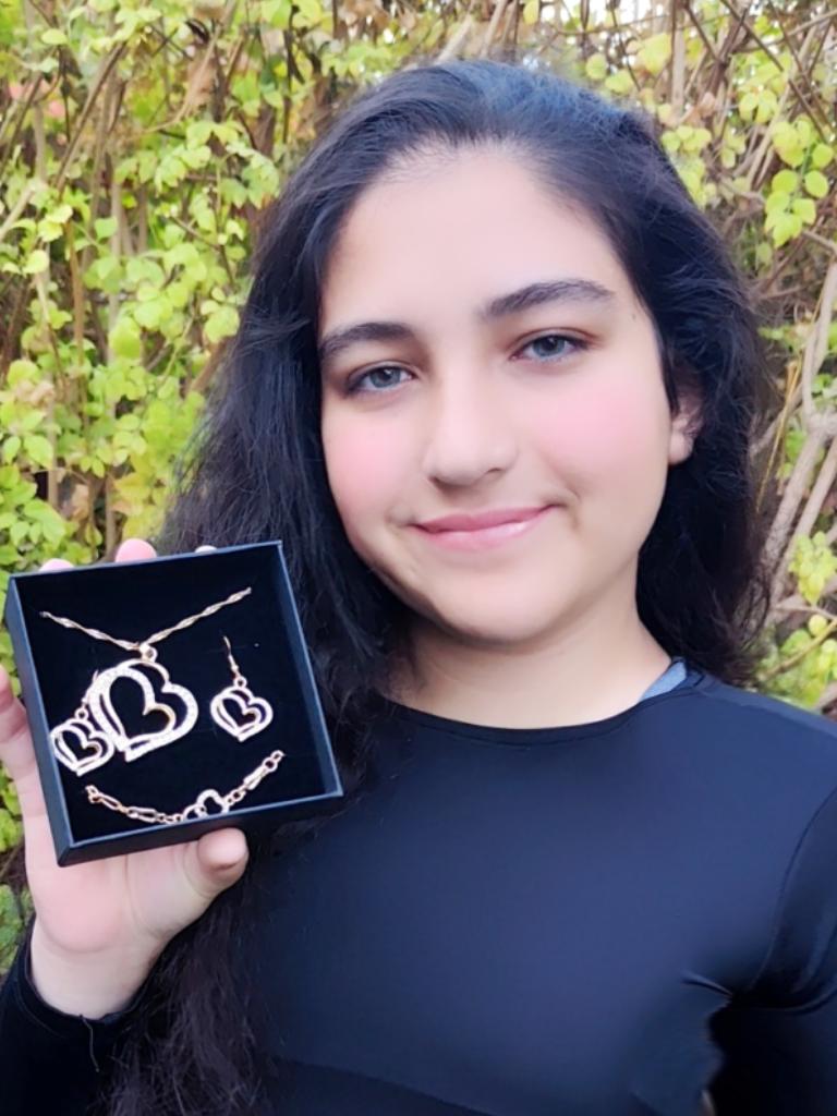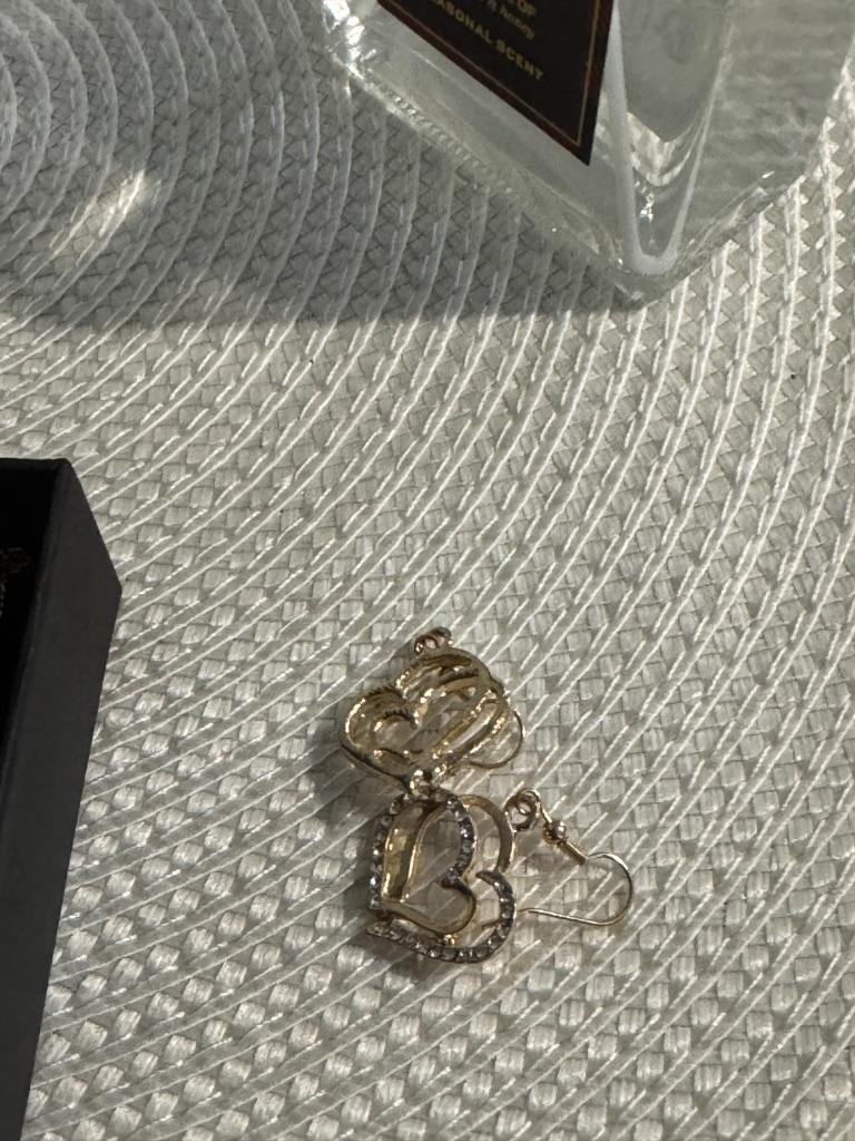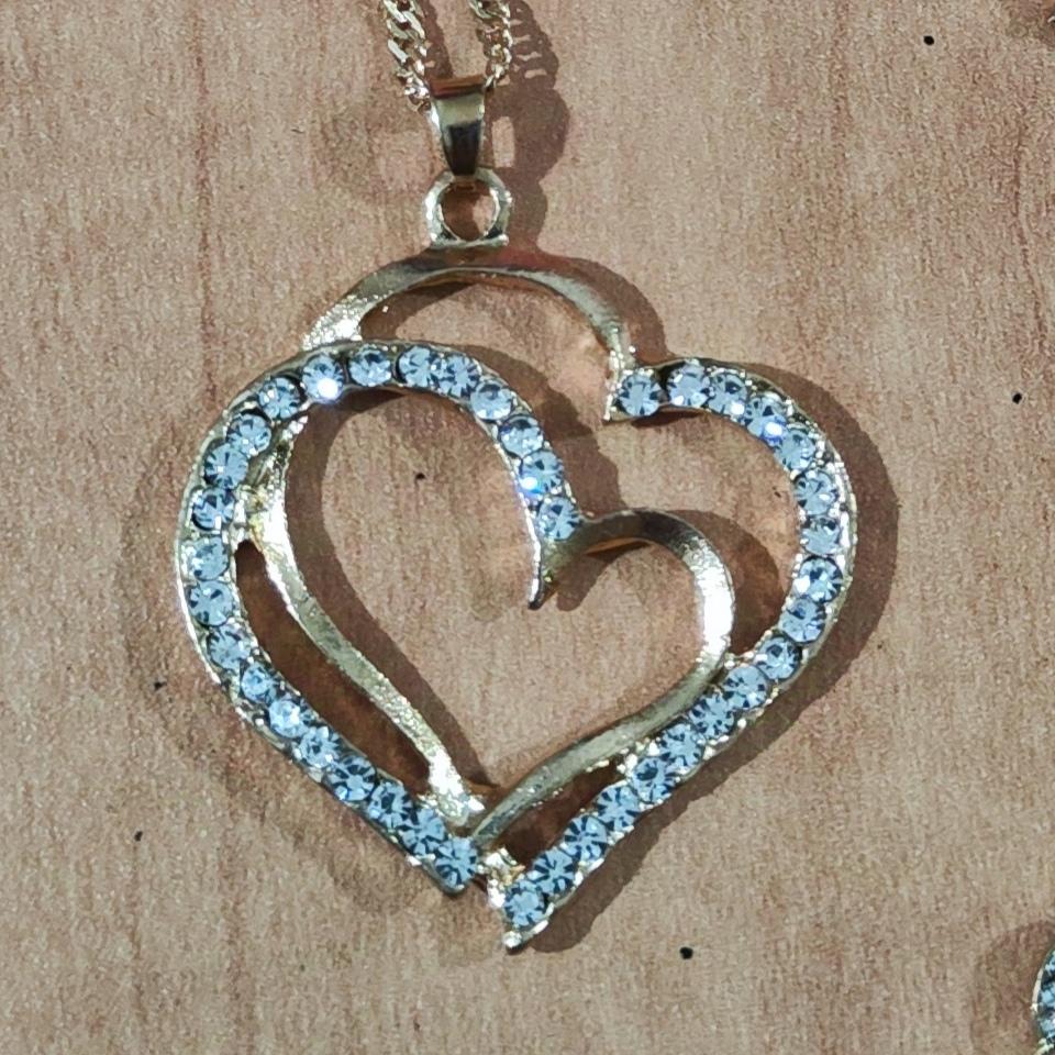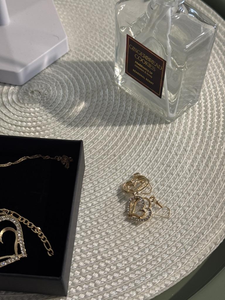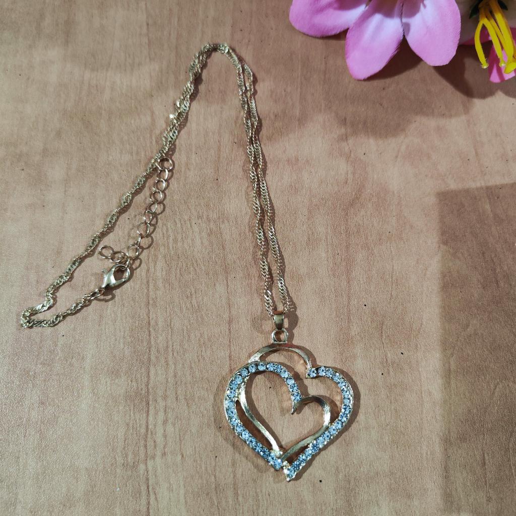 Very beautiful set with hearts in gold finish and clear rhinestones.The set consists of necklace,bracelet and earrings Perfect as a gift as came in lovely presentation box.Delivery took around 4 weeks.Happy Shopping!