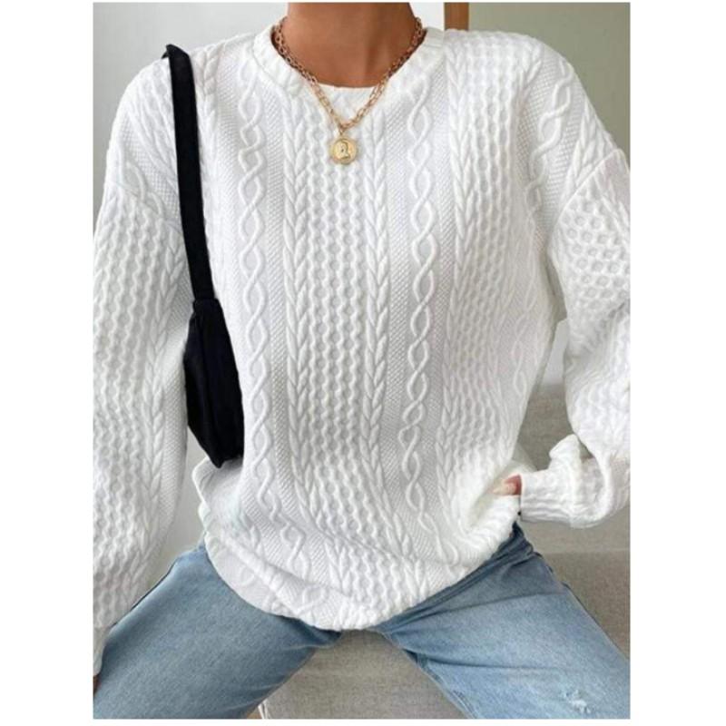 Women's Spring and Autumn Casual Comfortable Round Neck Jacquard Sweatshirt Long Sleeve Solid Color Pullover Top — buy online with free worldwide shipping!
