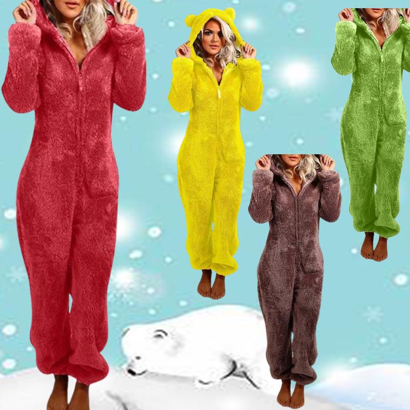 5XL Women Fluffy Jumpsuits Pajamas Plush Velvet Hooded Outfits Tracksuits Zipper Loose Casual Rompers Winter Warm Overall Homewears — buy online with free worldwide shipping!