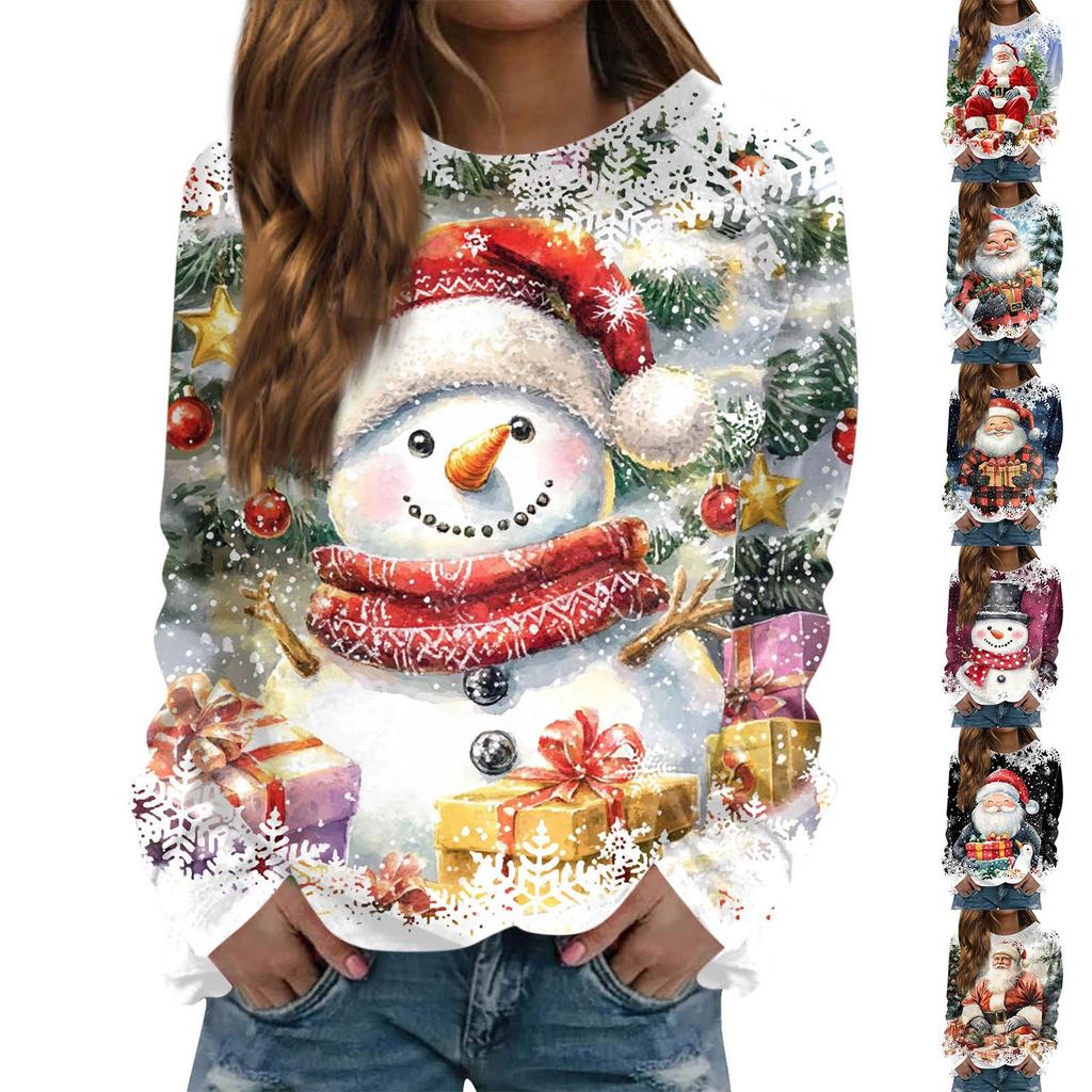 Women's Casual Fashion Christmas Print Long Sleeve Round Neck Pullover Top Blouse Sweatshirt