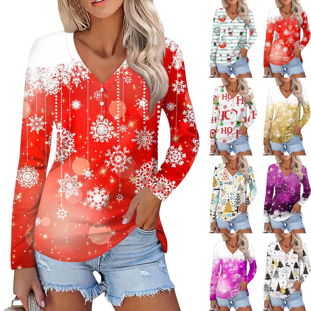 Women's Casual Fashion Sexy Comfort Christmas Printed V-Neck Button Long Sleeve — buy online with free worldwide shipping!