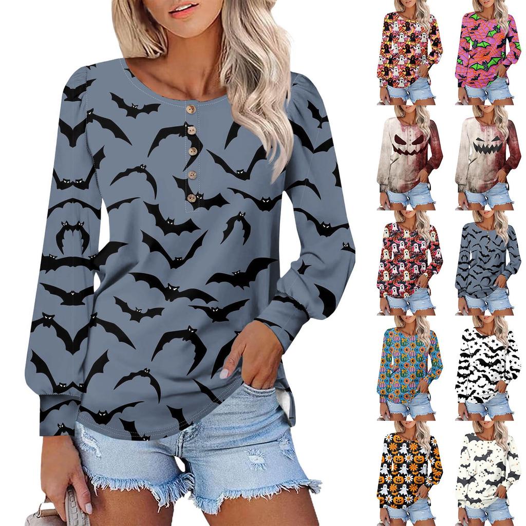 Women's Long Sleeve Round Neck T-Shirts Halloween Print Puff Sleeve Shirts Button Blouses Tops — buy online with free worldwide shipping!