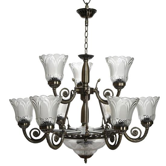 This light can be used as a ceiling chandelier, pendant light, hanging light or ceiling lamp to add a rustic touch to your interior. Antique chandelier with 12 lights. (6 at the bottom, 3 in the center head and 3 above it.). Size: Diameter 76.2 cm at the ceiling; Height from the ceiling 71.12 cm. Material: Brass and glass; Holder type: E27 (bulb is not included). The light requires E27 60W LED or incandescent bulbs. (not included).