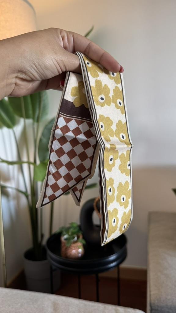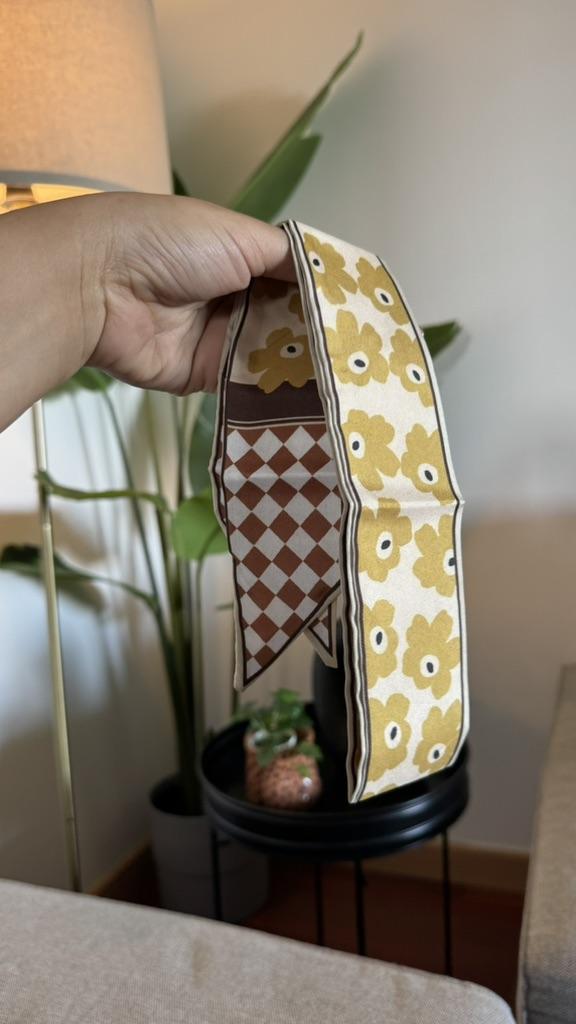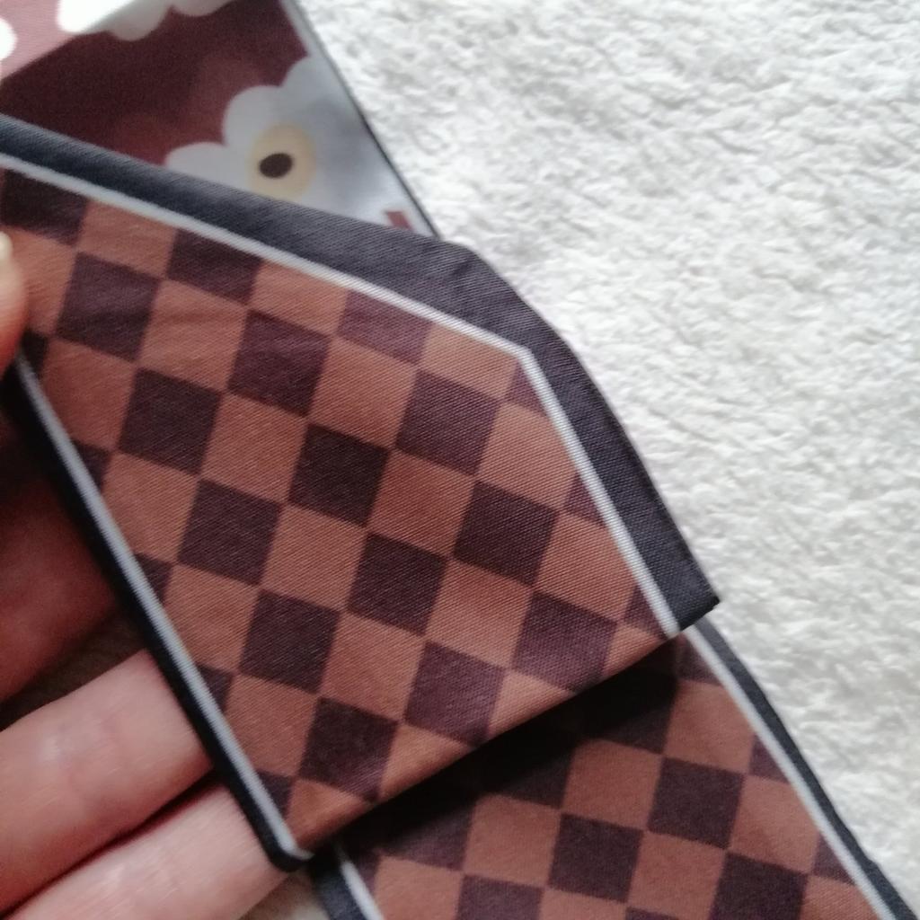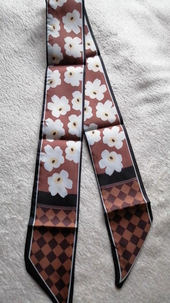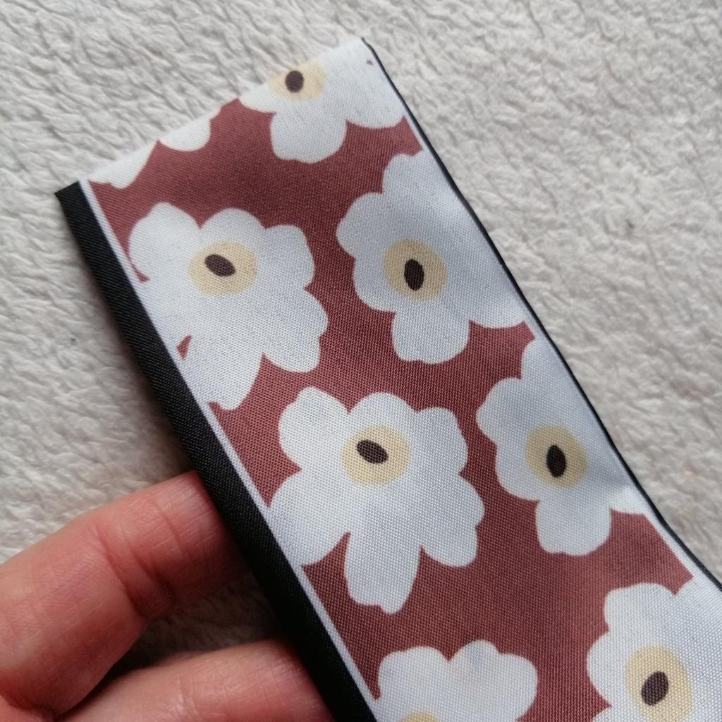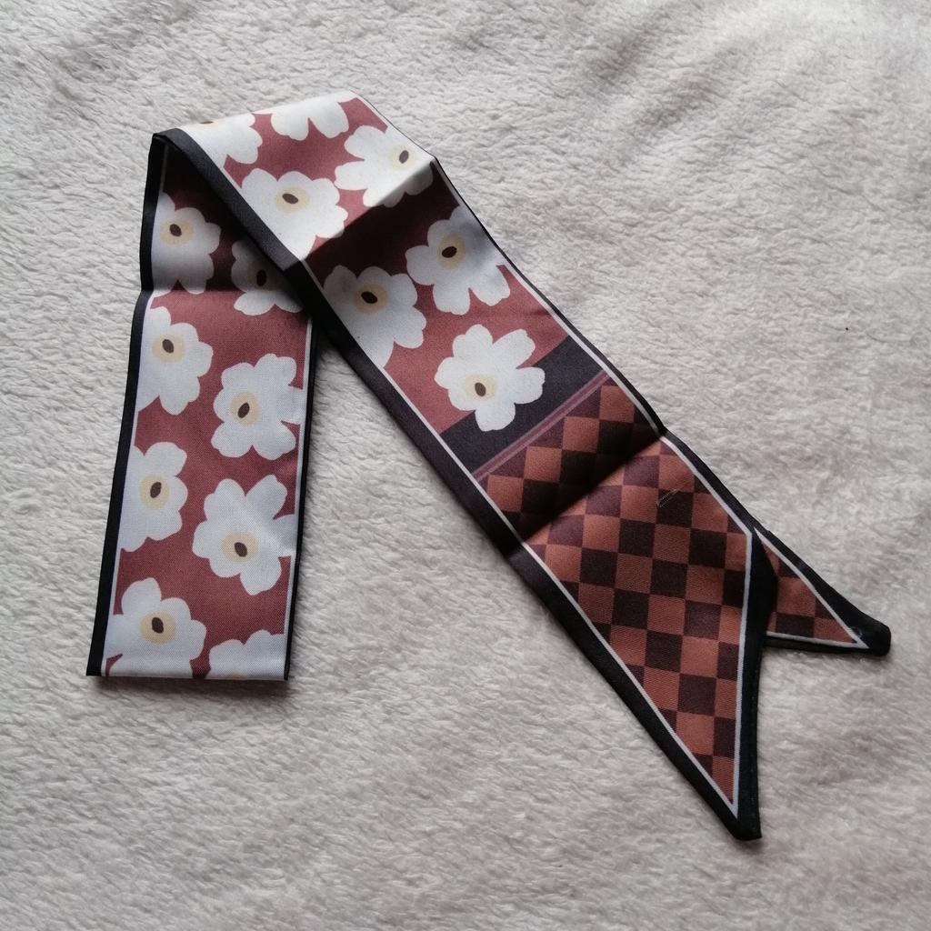 SCARF Beautiful small scarf that can be used in different ways: you can use it tied with a nice bow around your neck, you can decorate a hairstyle (tying the ponytail or as a 60s style headband), tied on your wrist or to decorate our favorite bag 😍😍 Arrived in Italy with tracking in 16 days.! Super fast shipping Wrap: clear plastic bag. The foulard measures 100 cm x 6.5 cm Material: 100% polyester The label with the composition and washing instructions is not applied to the scarf. The fabric is of good thickness,The profile is machine sewn carefully.No smell,no dangling threads.The print is well defined and without defects. It is available in 2 different patterns. Recommended purchase 👌