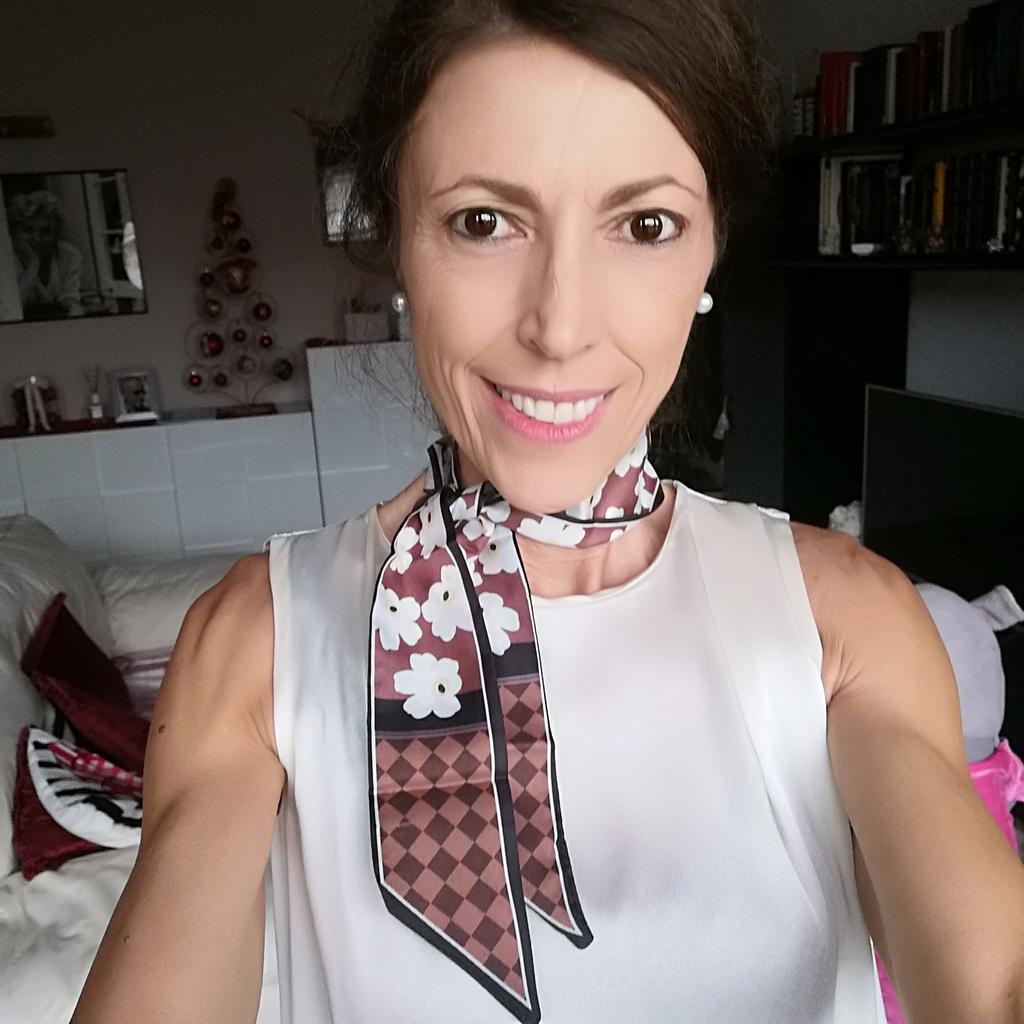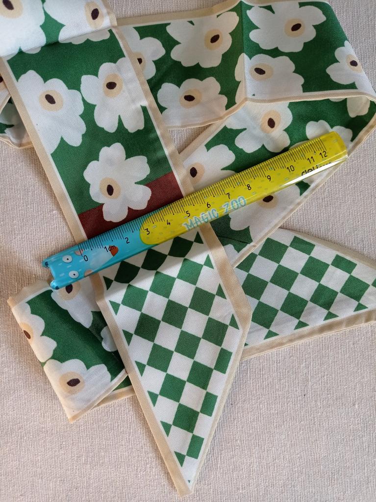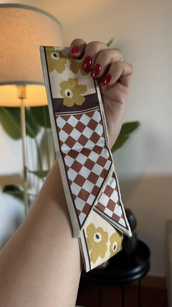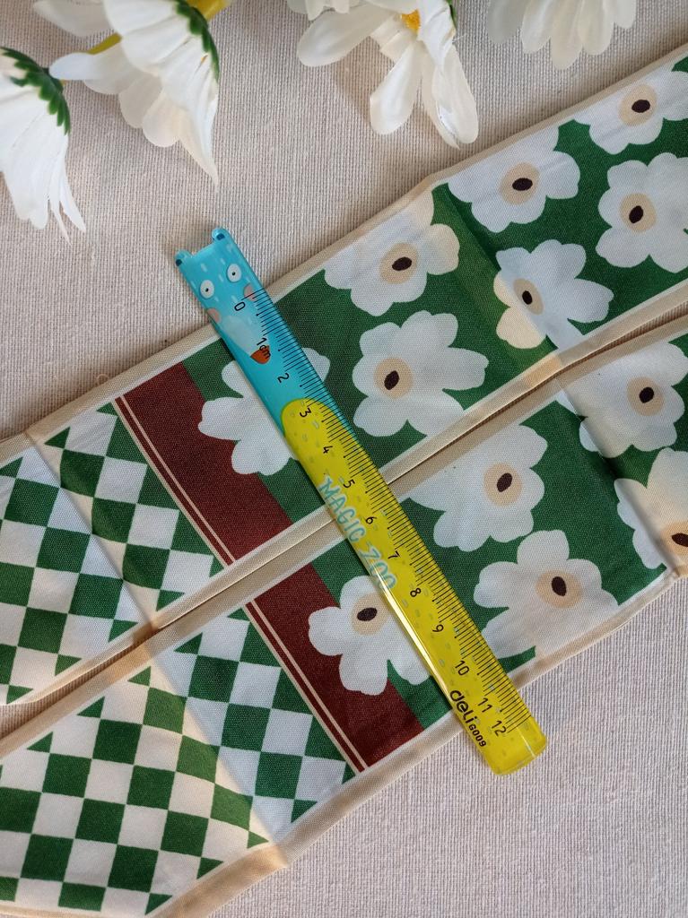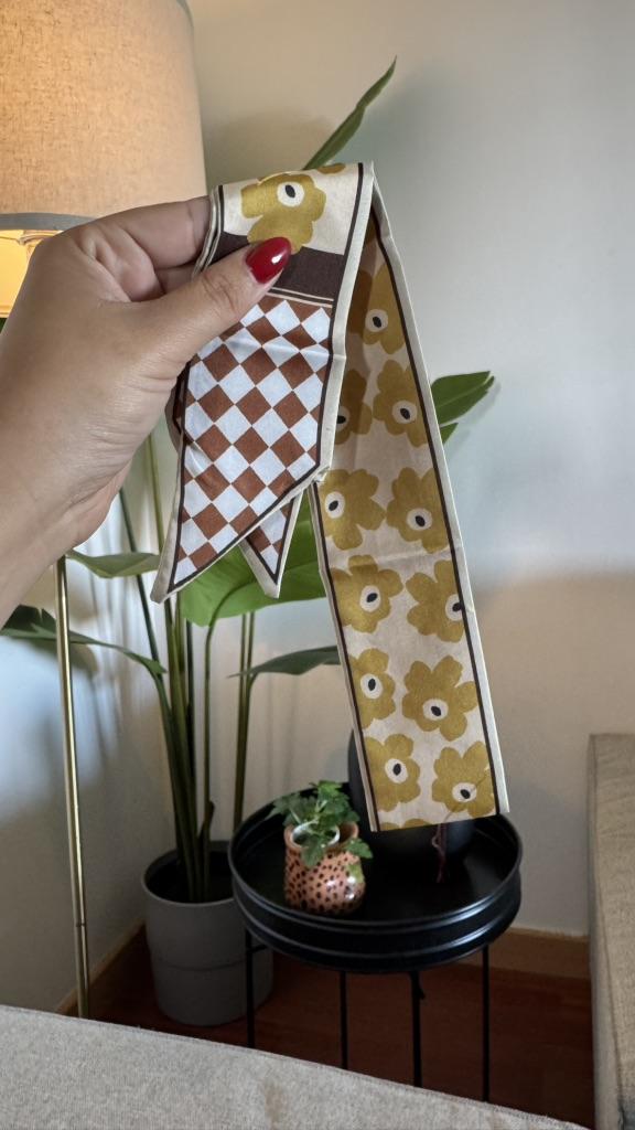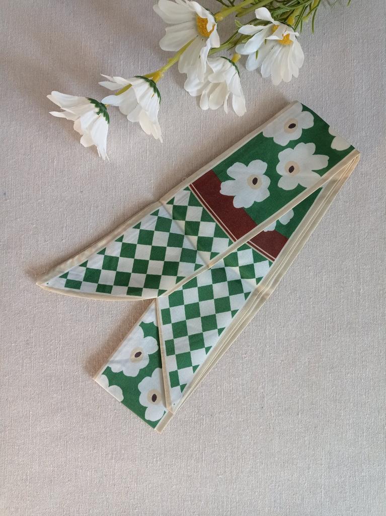 SCARF Beautiful small scarf that can be used in different ways: you can use it tied with a nice bow around your neck, you can decorate a hairstyle (tying the ponytail or as a 60s style headband), tied on your wrist or to decorate our favorite bag 😍😍 Arrived in Italy with tracking in 16 days.! Super fast shipping Wrap: clear plastic bag. The foulard measures 100 cm x 6.5 cm Material: 100% polyester The label with the composition and washing instructions is not applied to the scarf. The fabric is of good thickness,The profile is machine sewn carefully.No smell,no dangling threads.The print is well defined and without defects. It is available in 2 different patterns. Recommended purchase 👌
