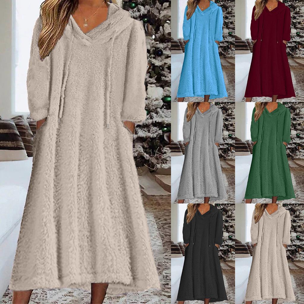 Women's Casual Round Neck Long Sleeved Pullover Loose Wool Hooded Long Sleeved Dress — buy online with free worldwide shipping!