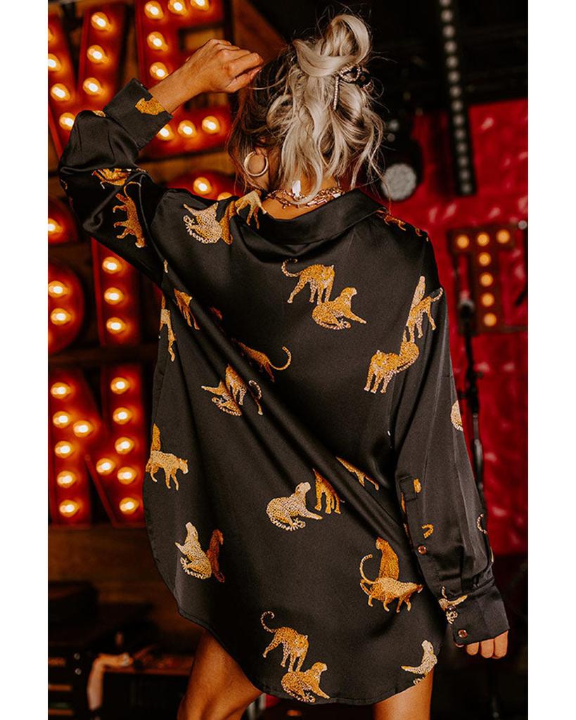 Azura Exchange Black Cheetah Animal Print Button Up Satin Shirt