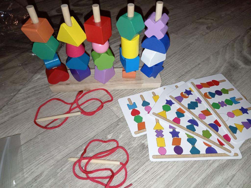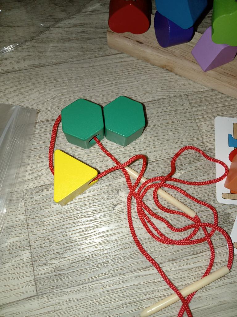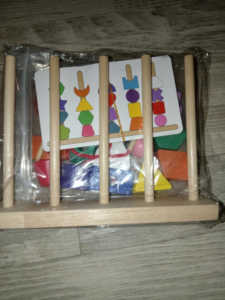 A wonderful game... There is a slight smell... The material is wood and the figures themselves are painted. Also two spokes with strings to thread them onto. Several game variations. Only two figures are repeated. The cards are made of thin cardboard. The set is made well.