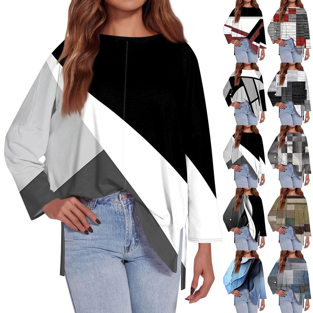 Women's Fashion Oversized Loose T-Shirt Round Neck Long Sleeve Side Geometric Splicing Printed Casual Top — buy online with free worldwide shipping!