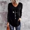 Animal Letters Feather Moon Printed 3D T Shirts Plus Size Black Tees Women Fashion V Neck Long Sleeve T Shirt