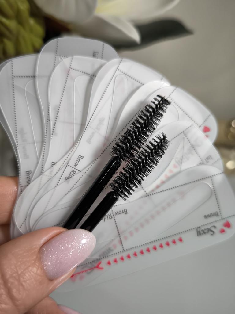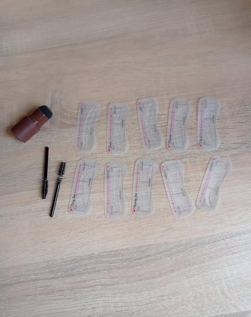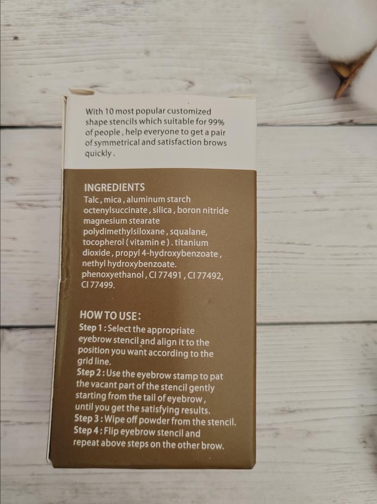 Set for eyebrows Powder 10 stencils 2 brushes this set will allow you to complete, complement or change your image. The set includes the powder itself, 2 brushes and 10 stencils for shaping eyebrows. Stencils of different shapes, and you can choose the shape that suits you. The set is very easy to use: Apply the stencil to the eyebrows Apply powder With a brush, direct the hairs and remove excess powder With this set, to get neat and perfectly symmetrical eyebrows, you will not need to go to the eyebrow salon. The volume of the tube is 3.5 grams. I recommend.
