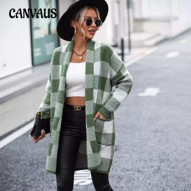 Autumn and Winter Women's Plus Size Coat Loose Plaid Colorblocking Knitted Cardigan Fashion Sweater — buy online with free worldwide shipping!