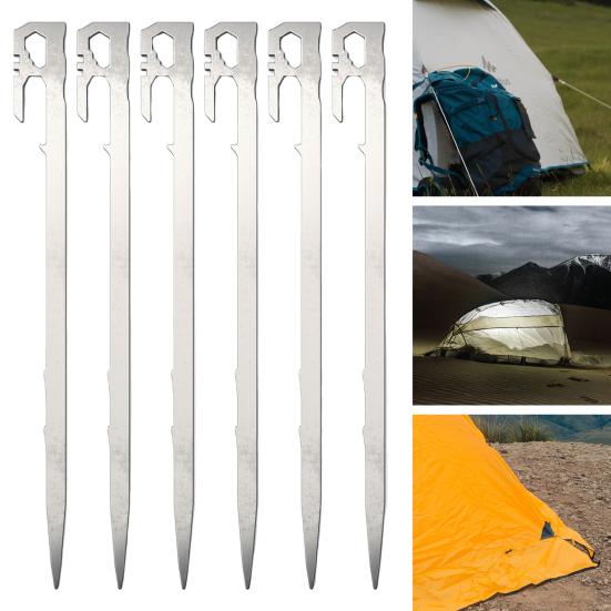 Ensure your tent stays secure in any terrain with these camping tent stakes. Crafted from high-hardness stainless steel, these pegs offer enhanced windproof dimensions and a spiked structure for excellent grip.