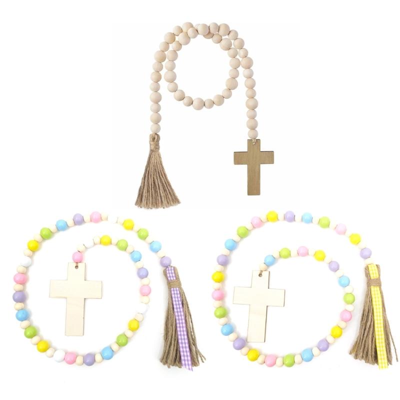 Easter Wooden Bead Cross Ornaments Bead Decoration Easter Hanging-Decor Ornaments Farmhouse Tiered Tray Prayer Bead