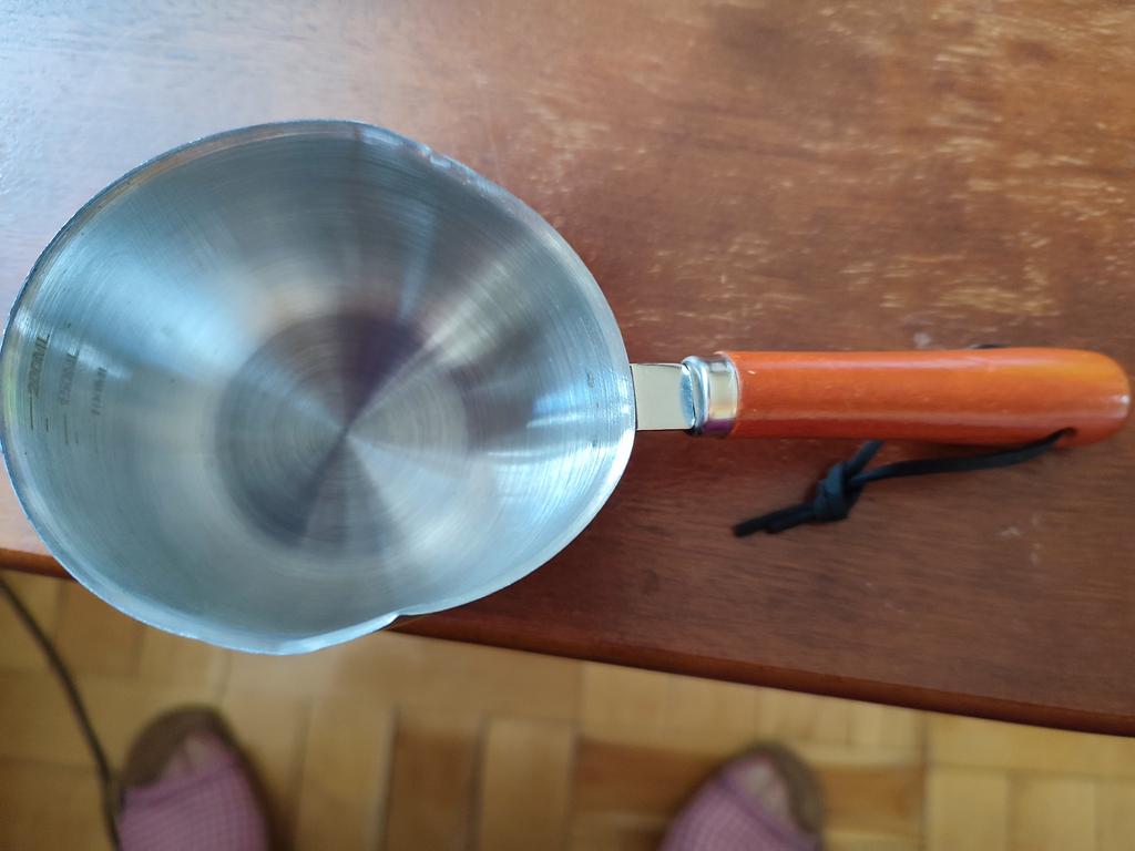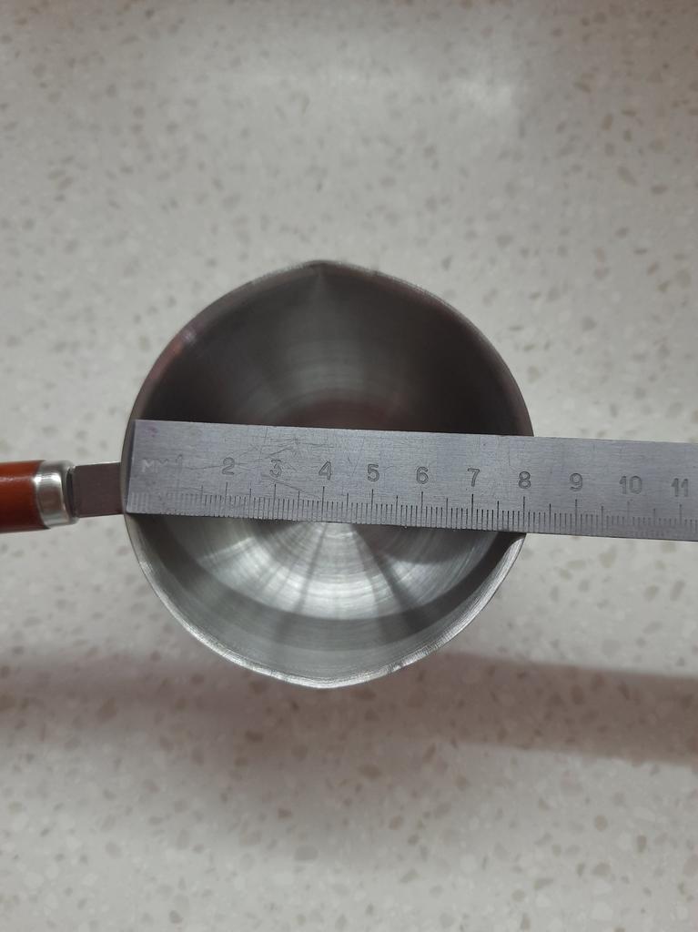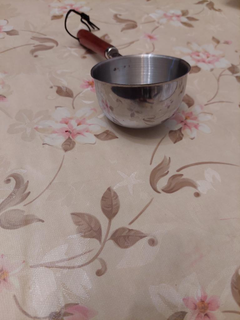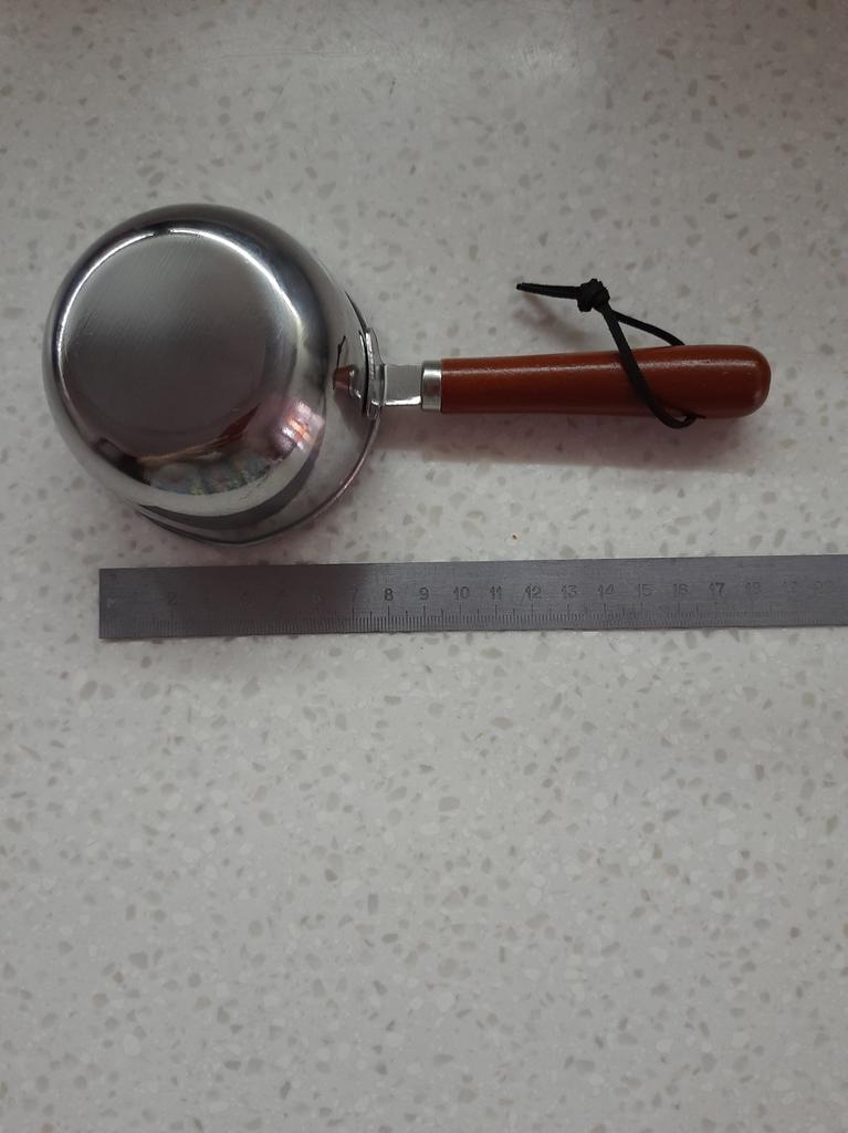 The ladle is very small. And, unfortunately, it does not stay on the stove, because, apparently, it is made of a very thin layer of stainless steel and under the weight of the handle the ladle falls over. If you want to heat a glass of milk in it or melt butter, you will have to stand at the stove and hold the ladle by the handle. On the plus side, the ladle has a wooden handle.