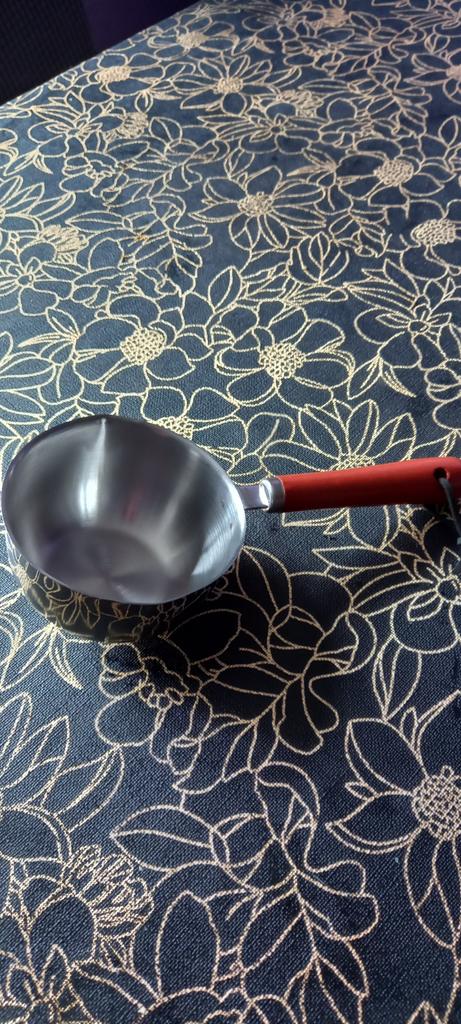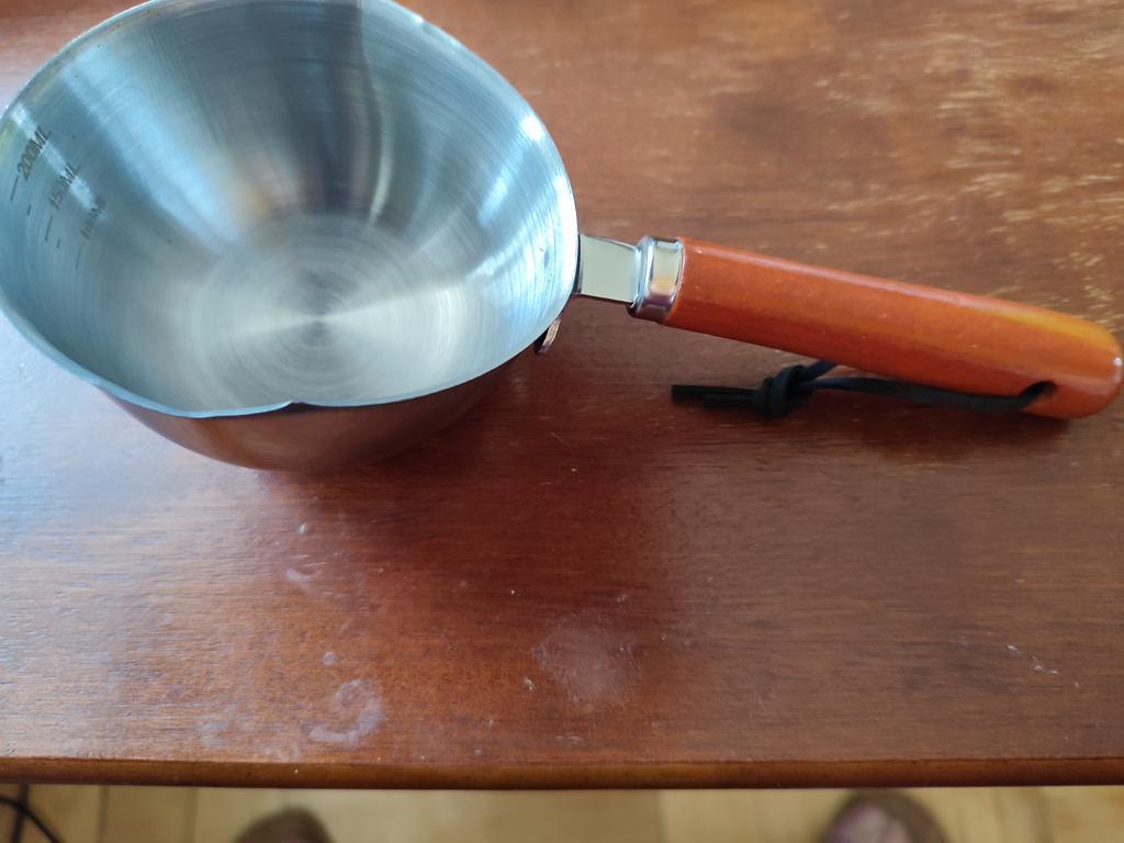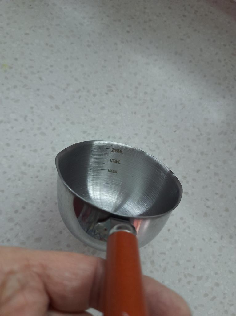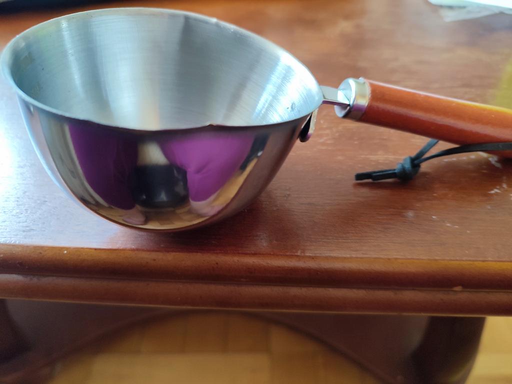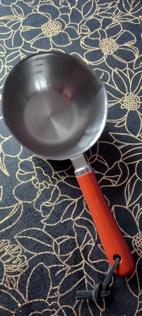 The ladle is very small. And, unfortunately, it does not stay on the stove, because, apparently, it is made of a very thin layer of stainless steel and under the weight of the handle the ladle falls over. If you want to heat a glass of milk in it or melt butter, you will have to stand at the stove and hold the ladle by the handle. On the plus side, the ladle has a wooden handle.