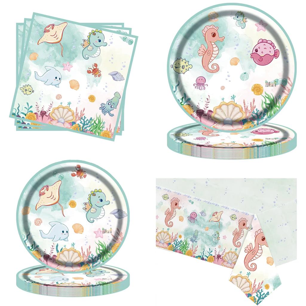 Under The Sea Party Disposable Tableware Sets Ocean Animals Seahorse Jellyfish Paper Dishes Kids Happy Birthday Party Supplies