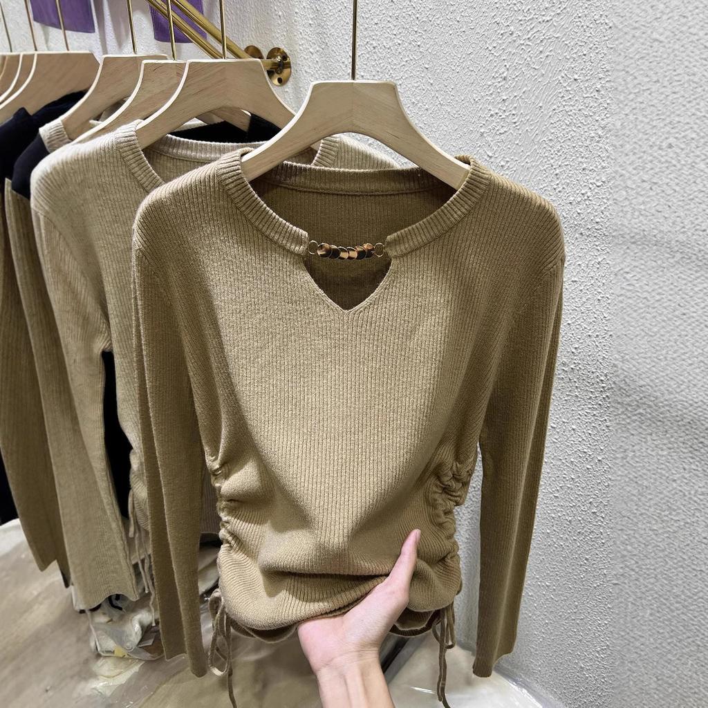 Designed Drawstring Hollow Sweater Women's Long-sleeved Autumn New Style Slim Temperament Niche Knitted Inner Top — buy online with free worldwide shipping!