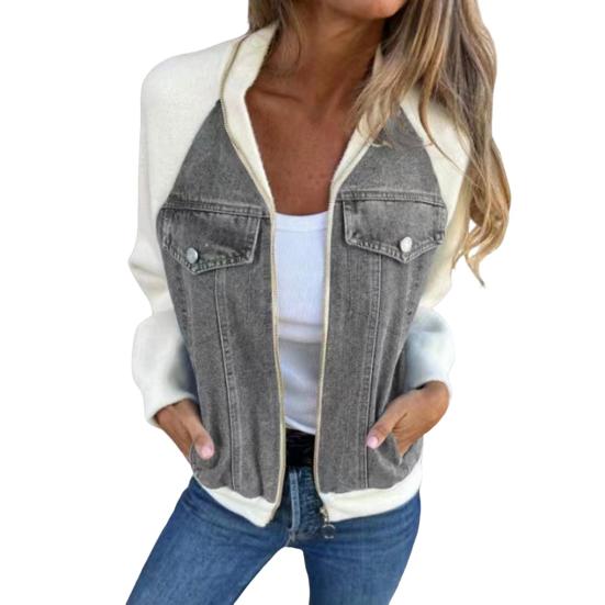 Made of a cotton and polyester blend spliced with denim fabric, this women's jacket offers a skin-friendly and non-deformable design. The contrast color lapel and zipper closure add a touch of sophistication to the overall elegant appearance.