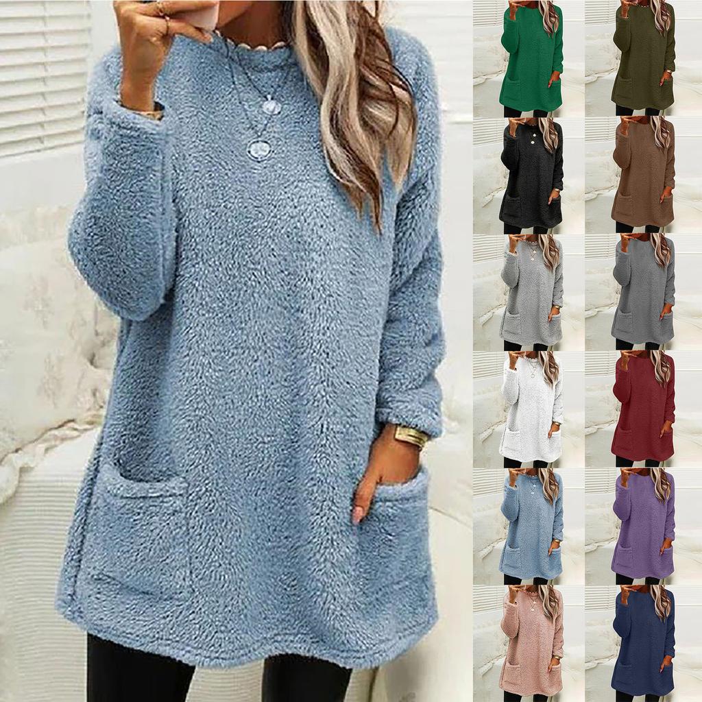 Autumn And Winter Women's Solid Color Round Collar Casual Loose Long Sleeve Pocket Plush Sweatshirt Women — buy online with free worldwide shipping!