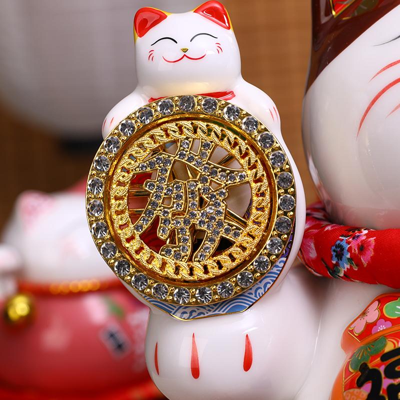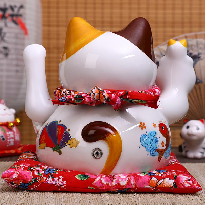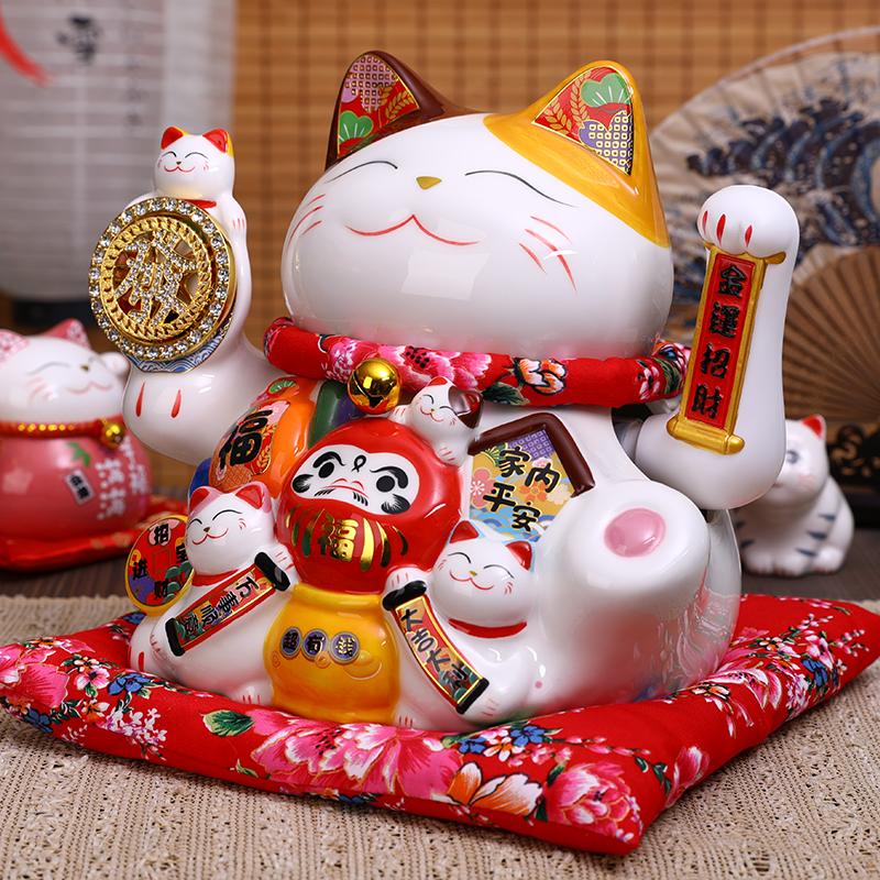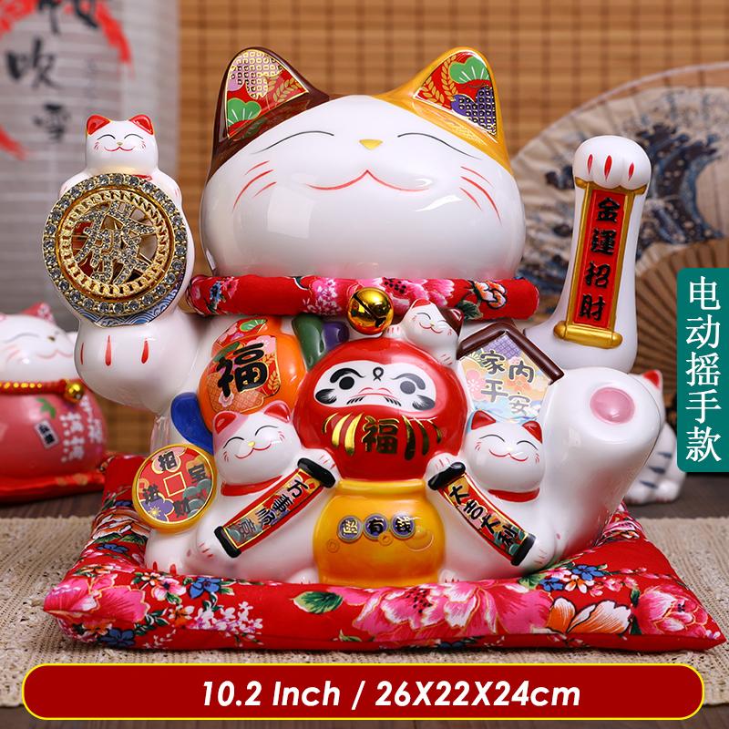10.2 Inch Large Lucky Cat Maneki Neko Ceramic Beckoning Cat with Movable Arm Porcelain Figurine Decorative Statue — buy online with free worldwide shipping!