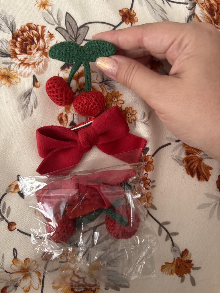 Cherries are super cute 🥰 but a bow is pinkish in real life. They can't be worn as a set