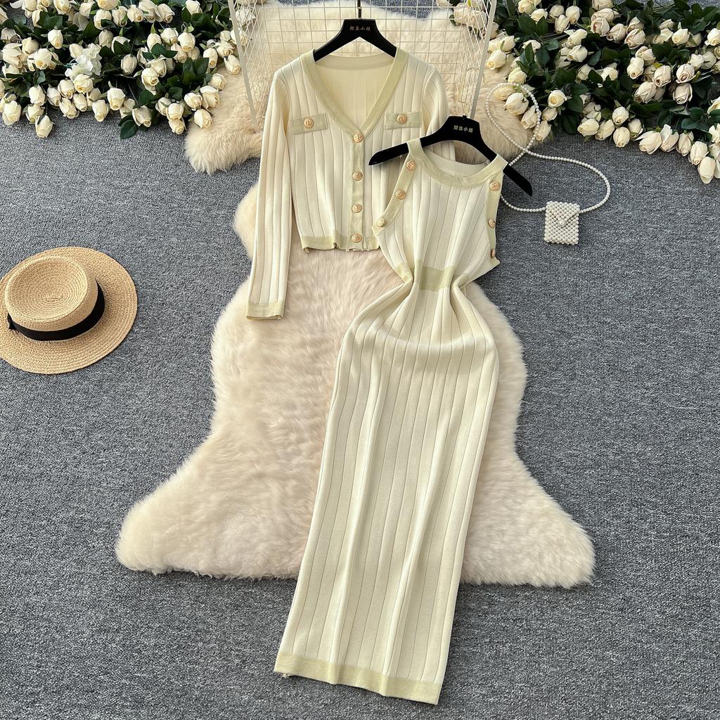 Autumn Winter Women Knitted Sweater Two Piece Set V-neck Jacket Coat and Sleeveless Long Midi Slim Bodycon Sheath Dress Suit — buy online with free worldwide shipping!